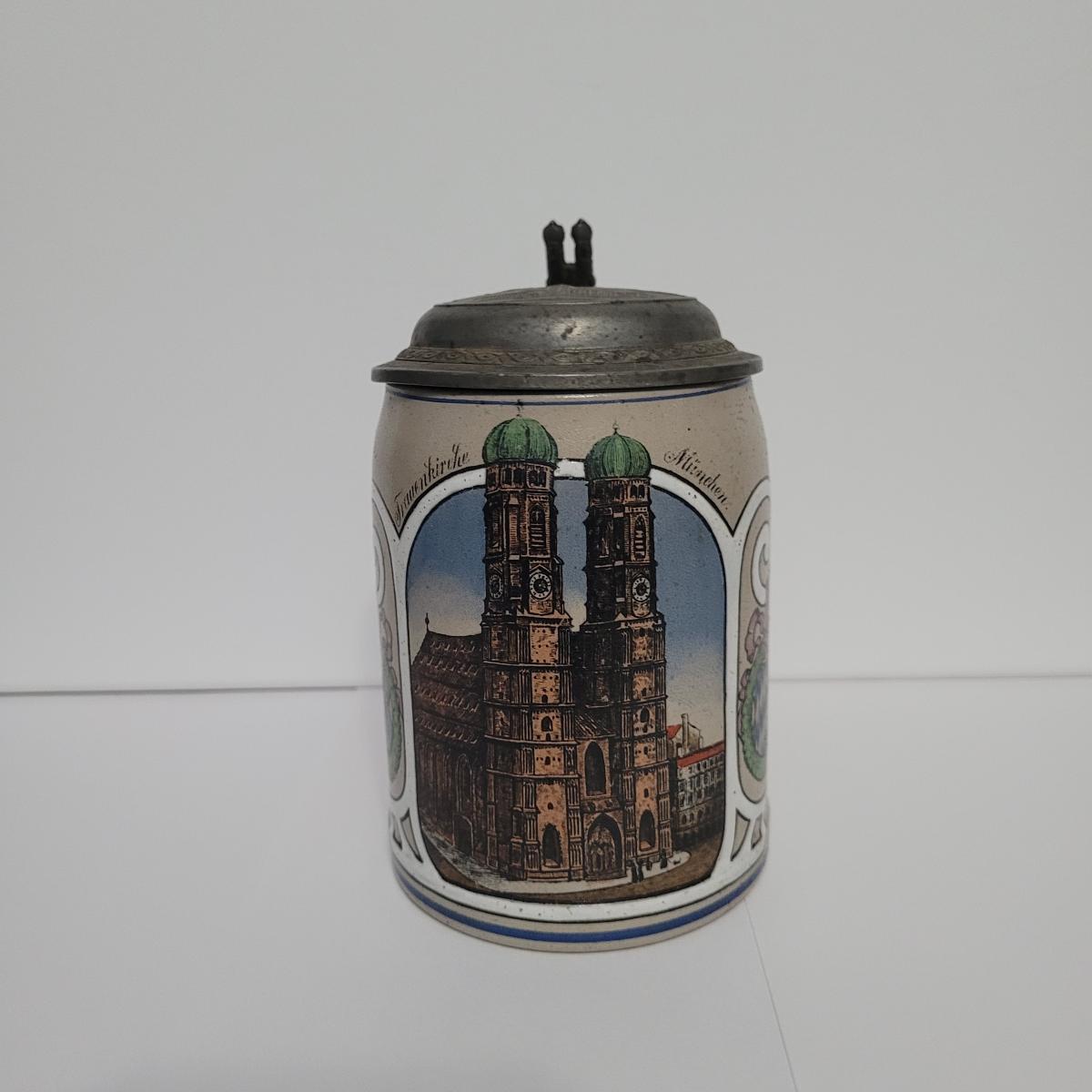This stein shows the stamp of Steinzeug-Industrie Coblenz and depicts Frauenkirche cathedral in Munich