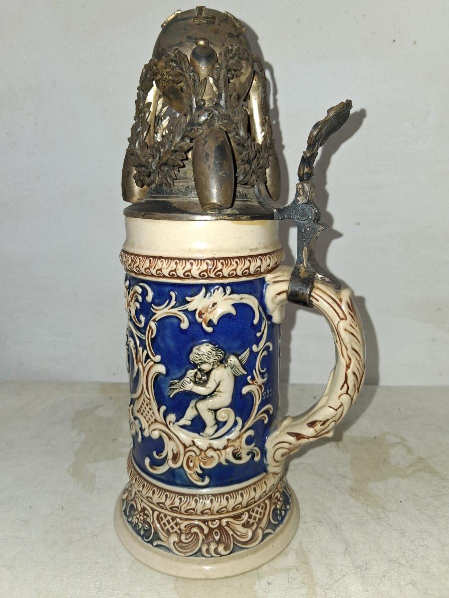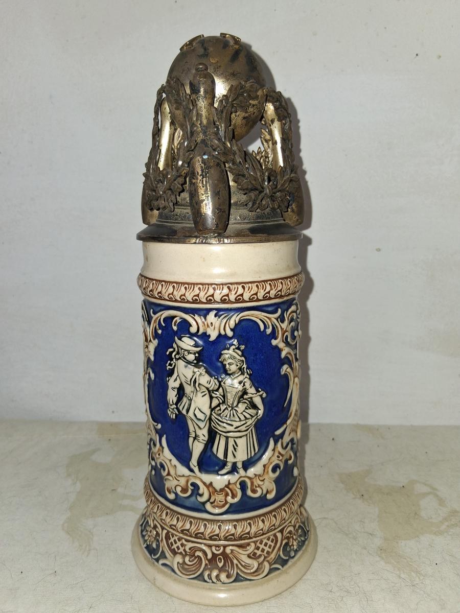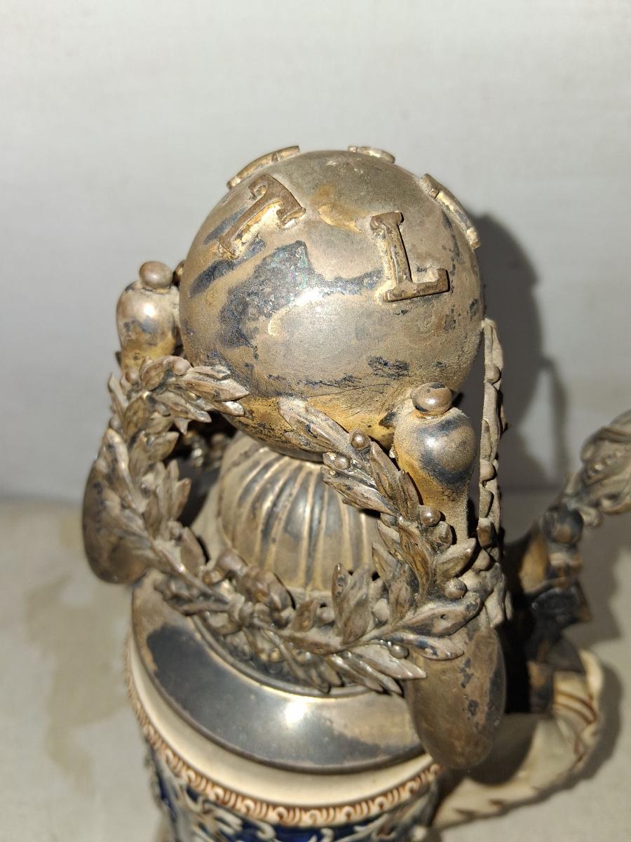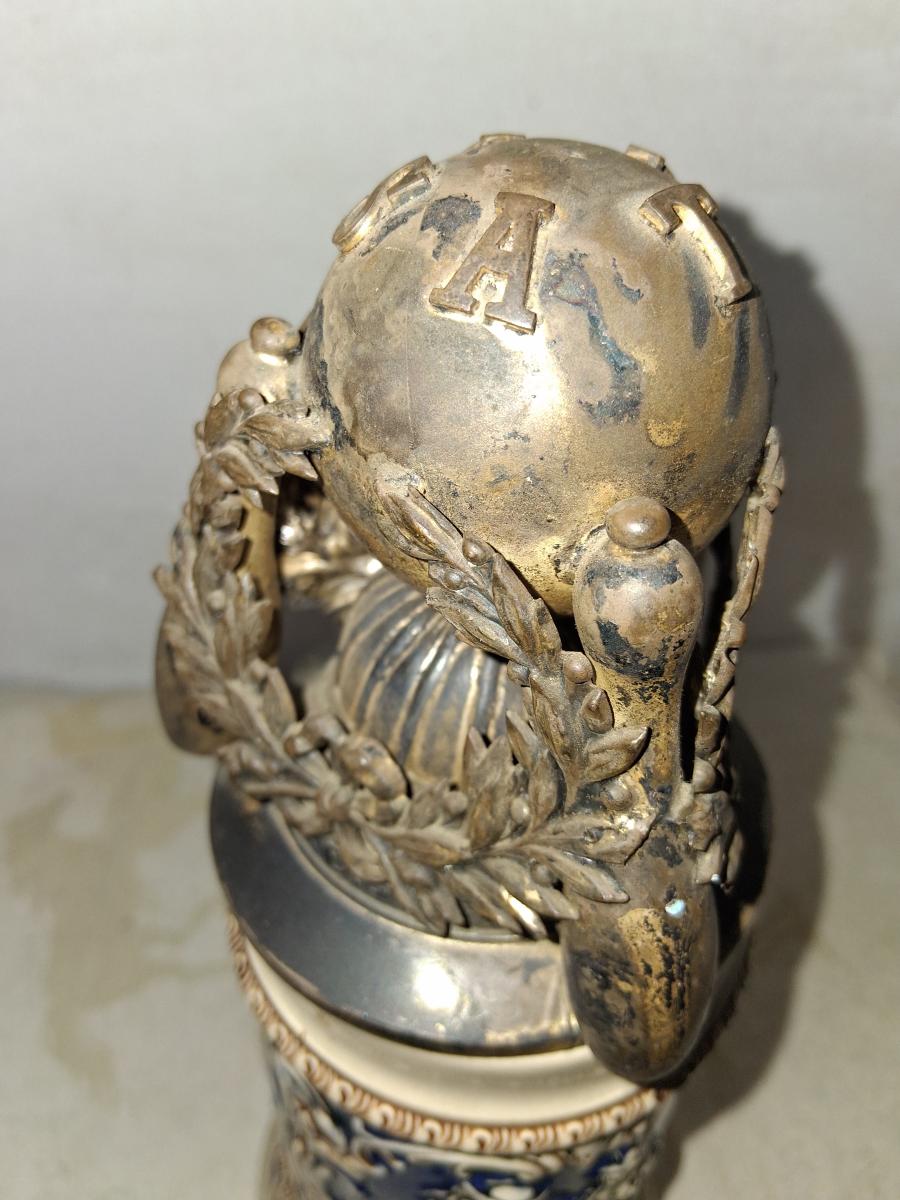 The point of this stein is the custom lid. It's silver plate and features a kegul with three kegels leaning against it, covered by wreathes and with the initials S A T L A (order uncertain). The meaning of the letters is unknown. Quite possibly this was a kegeling trophy. See here [link] for the 235 with a regular lid. Recessed base.