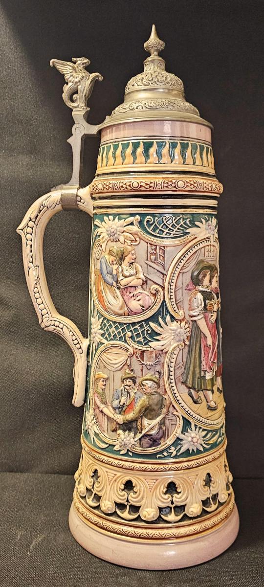 3 liter Dumler & Breiden relief, full color stein made between 1895 and 1910 based on the artwork of Franz defregger. "defregger Images"