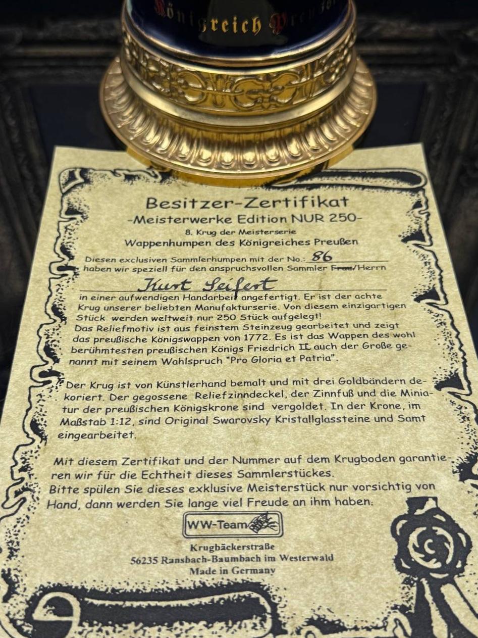 The souvenir mug is made at the modern manufactory of WW-Team. This model is dedicated to The Kingdom of Prussia (Königreich Preussen), as evidenced by the inscription on the base and the central coat of arms.