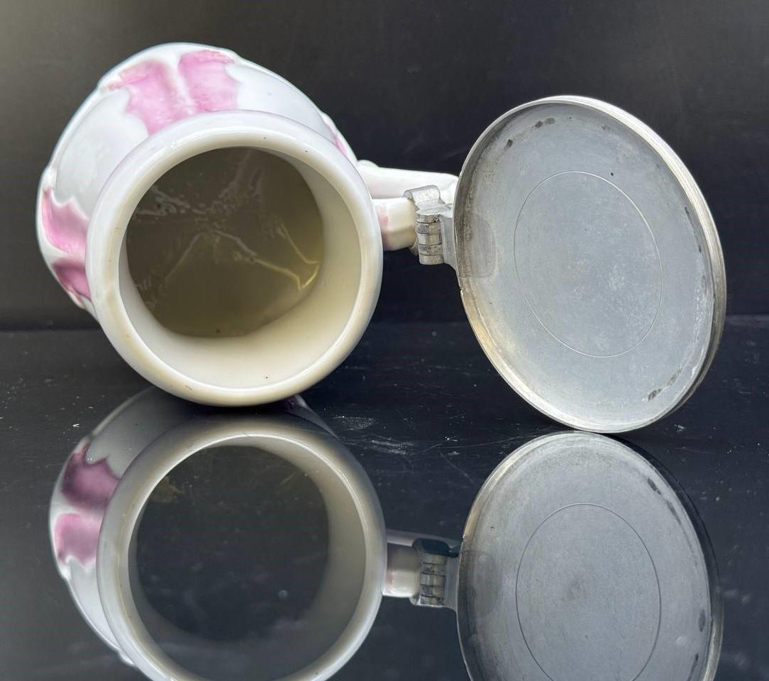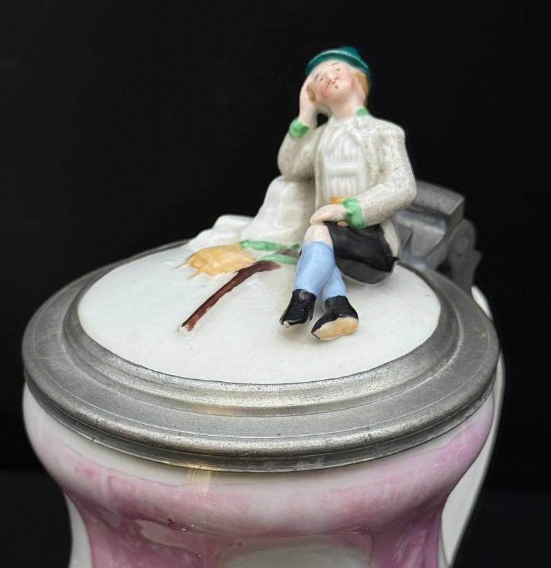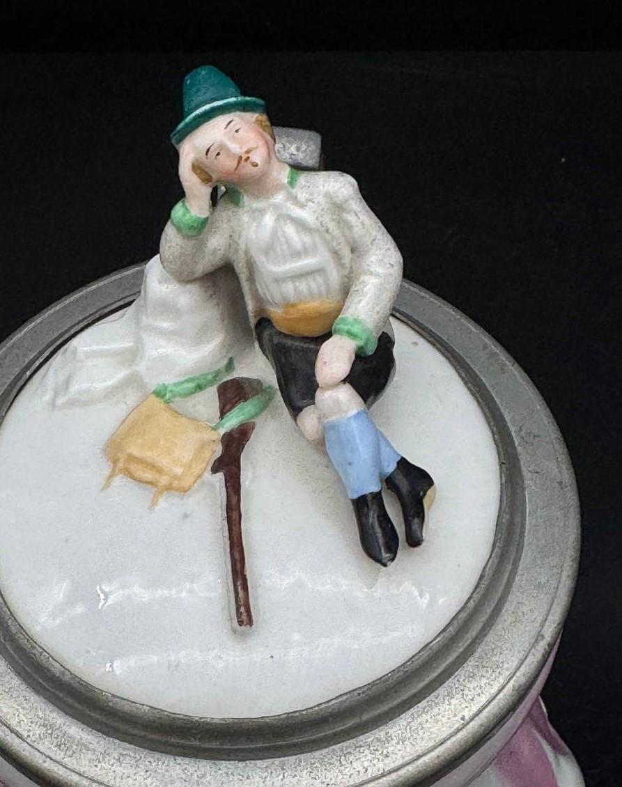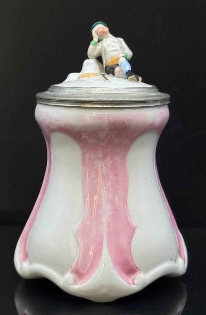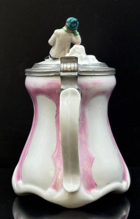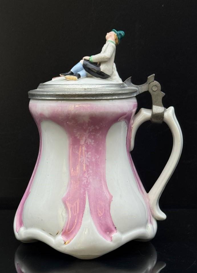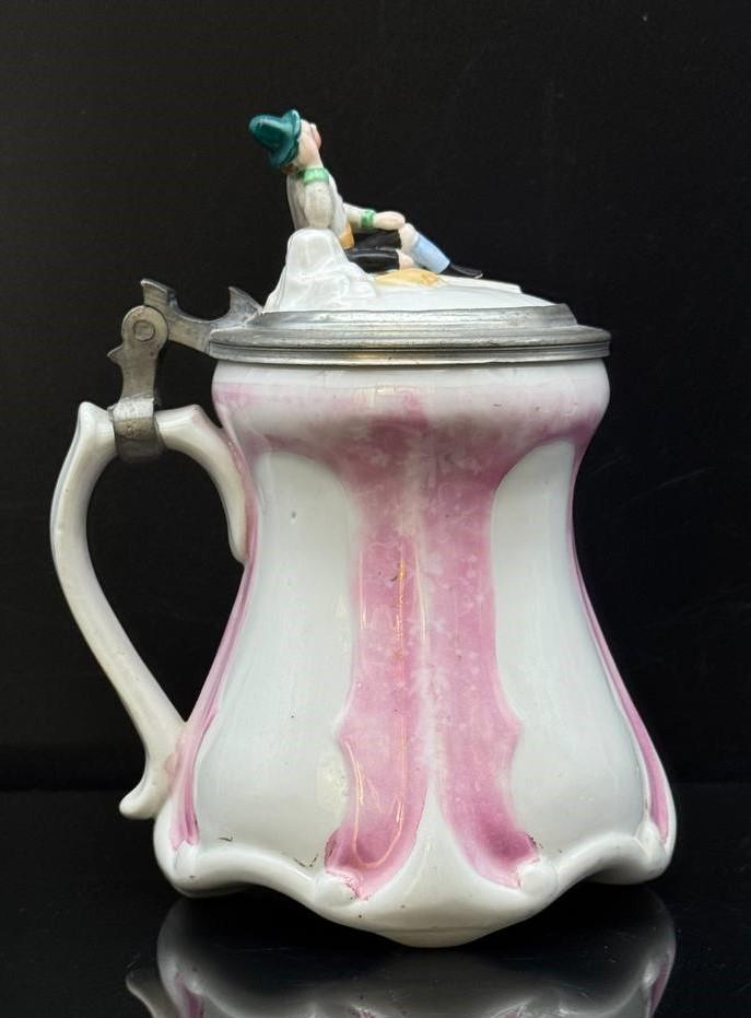 Antique porcelain beer mug from Villeroy & Boch "Resting traveler". The capacity of the mug is about 0.5 liters. The absence of a label indicating the size of the mug's capacity suggests that the mug was made before 1871. At the same time, we can definitely say that this unique and very rare mug should be perceived as a guest from the distant 1860. In the same year, the Luxembourg division of Villeroy & Boch (V&B) began to produce mugs of this shape. The milky white porcelain surface of the mug is decorated with a delicate pink painting. Vertical pink lines are applied to the surface of the edges, leaving the mirror of the faces intact. If you carefully examine the pink-colored surfaces, you can see the outlines of the elements of the floral decor on them. Such fine handwork by decorative artists significantly increases the collectible value of the item. The tin lid is inlaid with a porcelain insert, which is crowned by a statuette in the form of a resting traveler. The design of this mug was for half a century ahead of its time. In the middle of the 19th century, it was not customary to experiment with the shape of a beer mug — to move away from the usual cylindrical or conical shape to shapes with faces and edges. Although the artists tried to look for new forms within the framework of existing foundations. As a result, the mug received a rectangular base and a round upper part. It looked quite decent and did not cause rejection. Rather, the opposite is true. The design, so unusual for its time, began to be in demand. The explosive demand has led to other market participants starting to produce mugs in a similar style. In addition to Villeroy & Boch, mugs of this shape were produced at factories Utzschneider & Cie — Sargemins (Sargemin, Lorraine, France until 1871) and Dorfner and Co. (Hirschau, Bavaria).