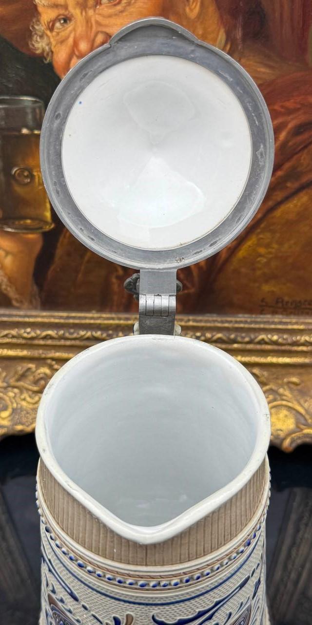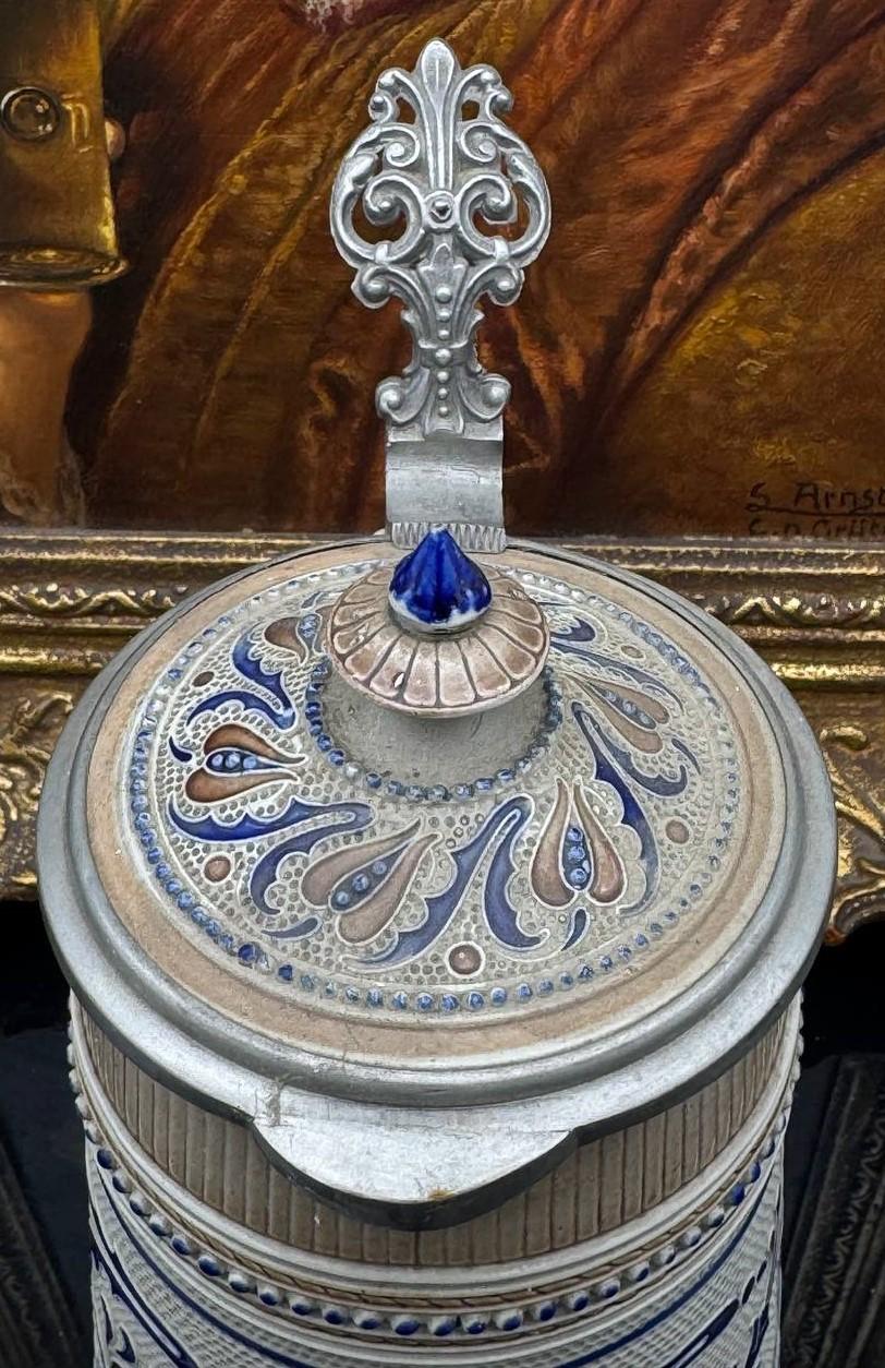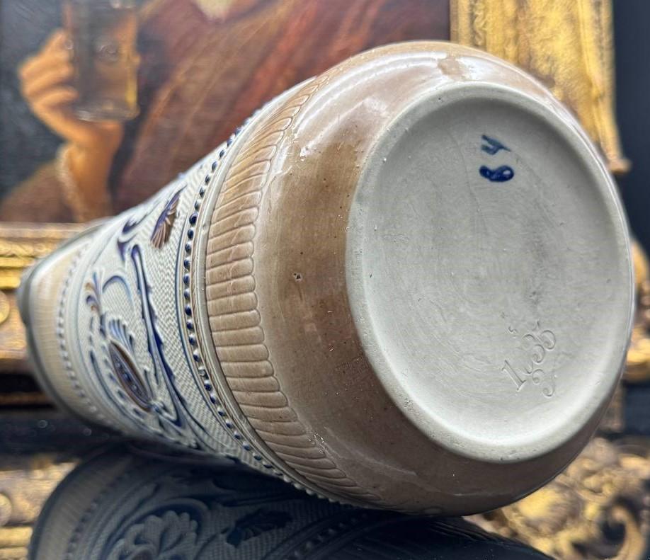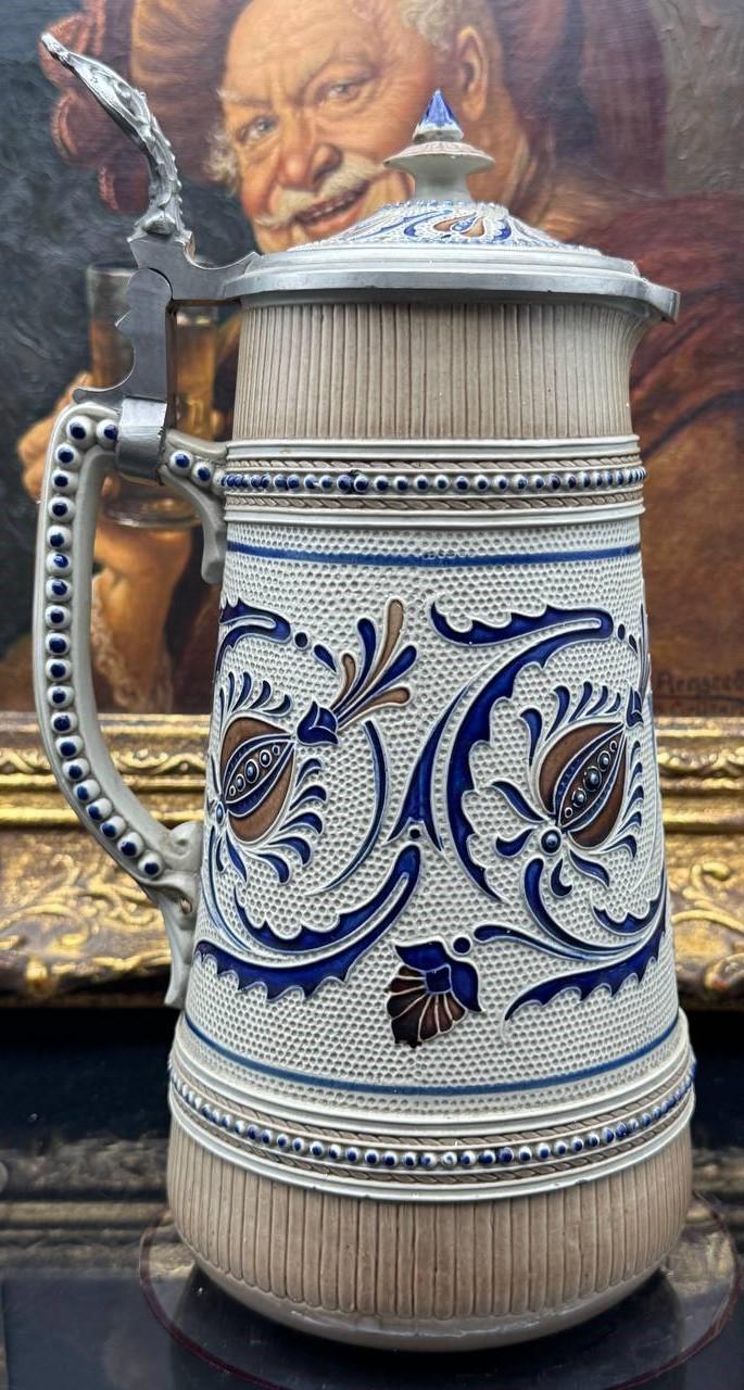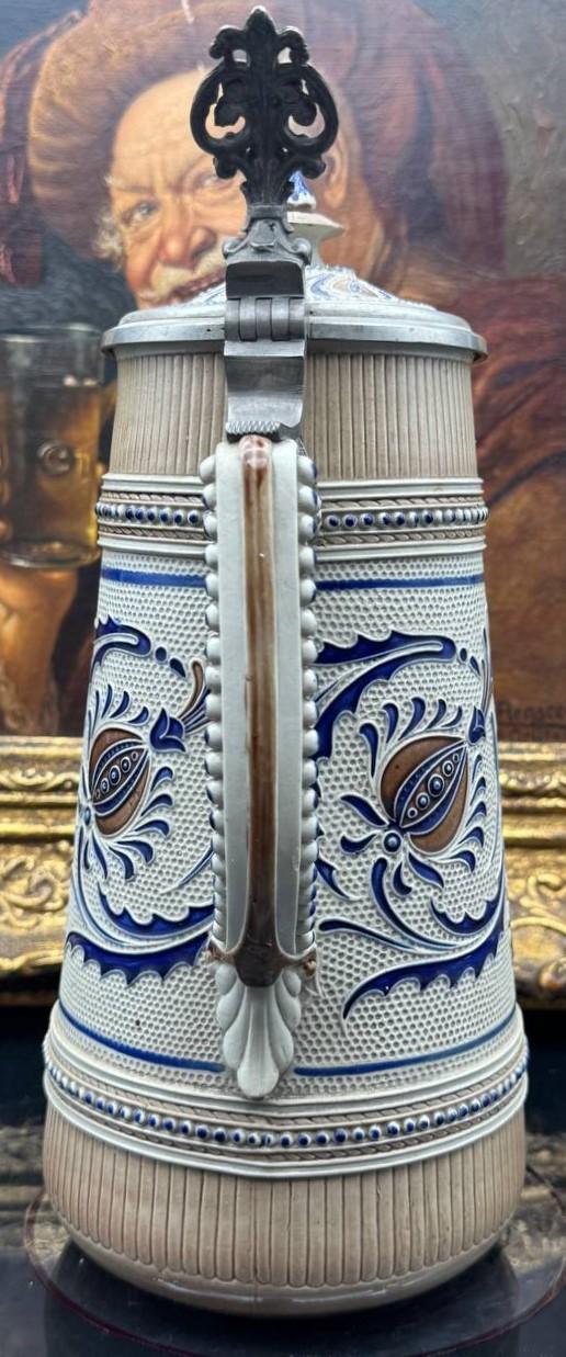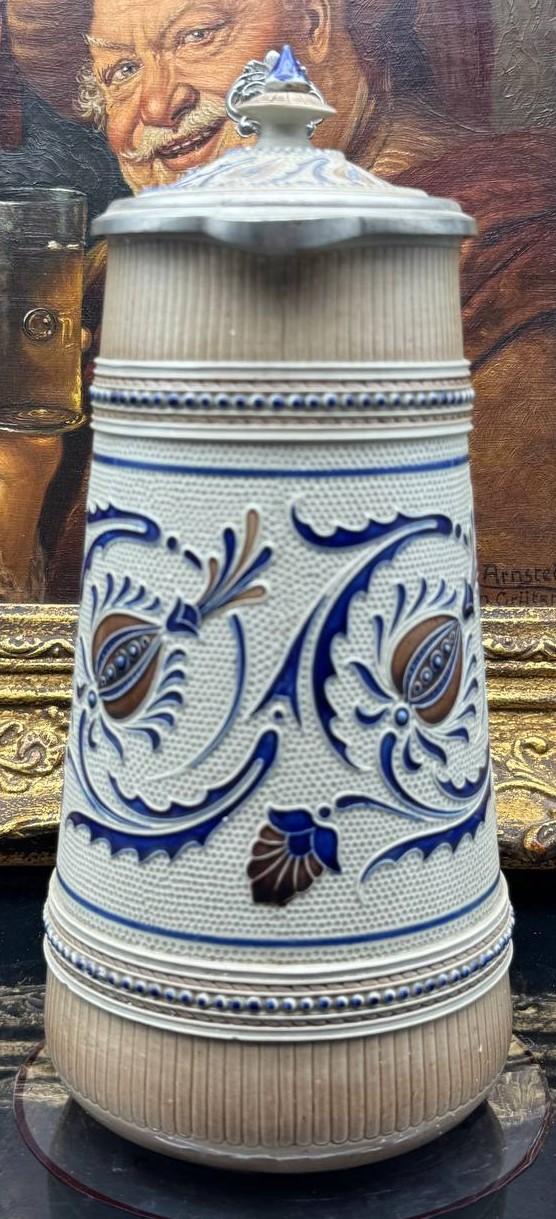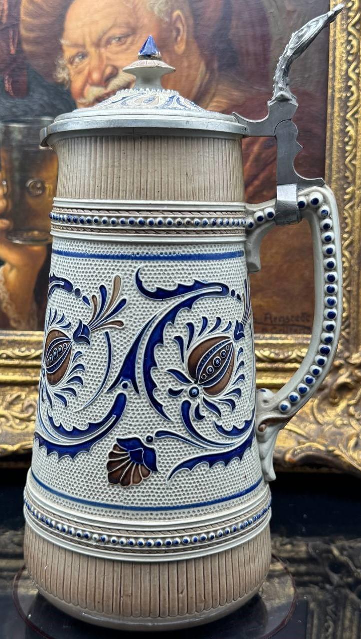 An antique beer jug with a capacity of 1.5 liters. It was made in 1905 at the famous German manufactory Villeroy & Boch. The surface of the jug is decorated with floral ornaments. The drawing is applied in the technique of relief carving on ceramics. A high level of manual labor creates a high value for the product. The jug is equipped with an inlaid lid made in the same technique.