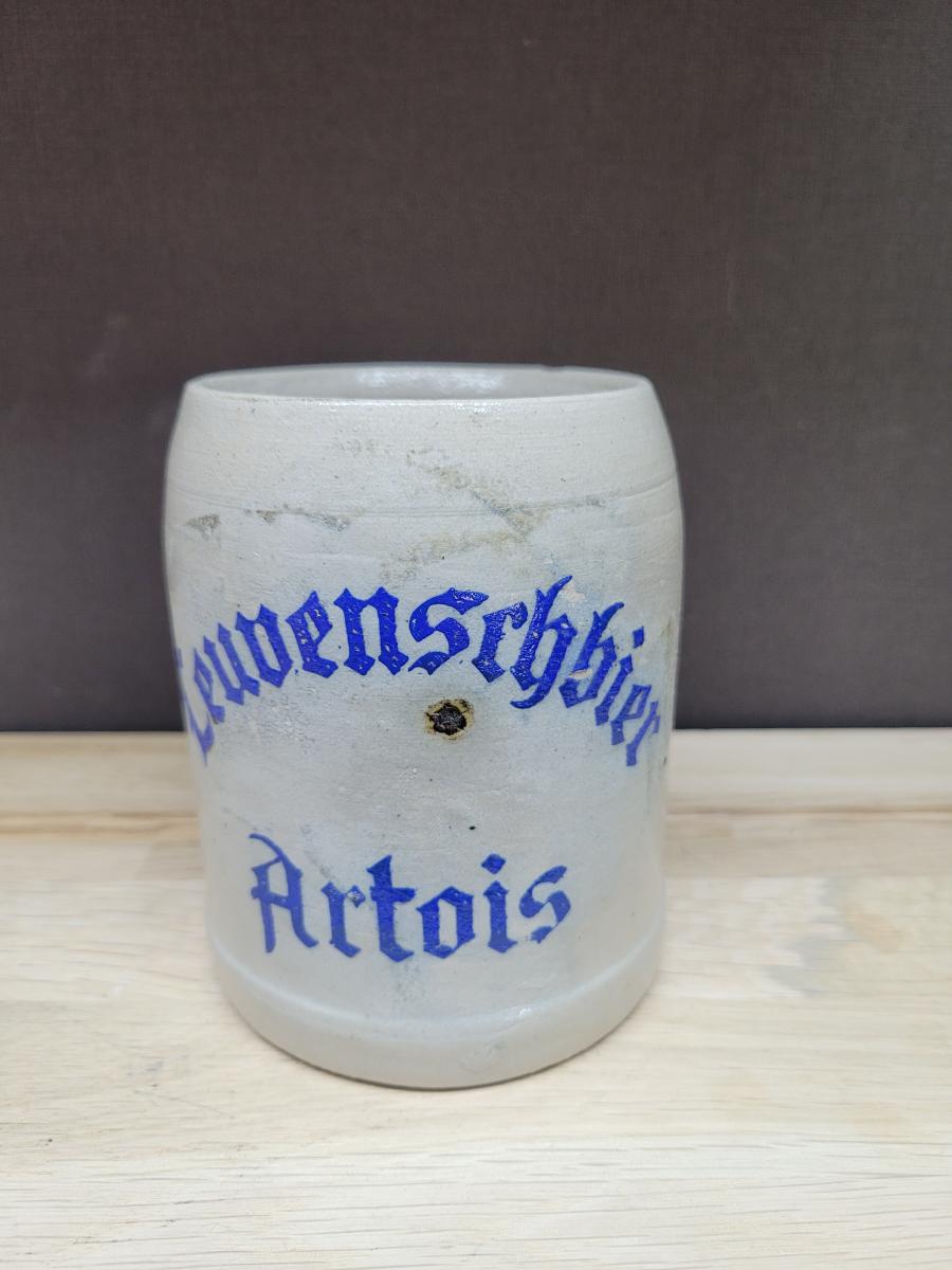 A hand thrown stoneware beer stein, advertising Leuvenschbier Artois.