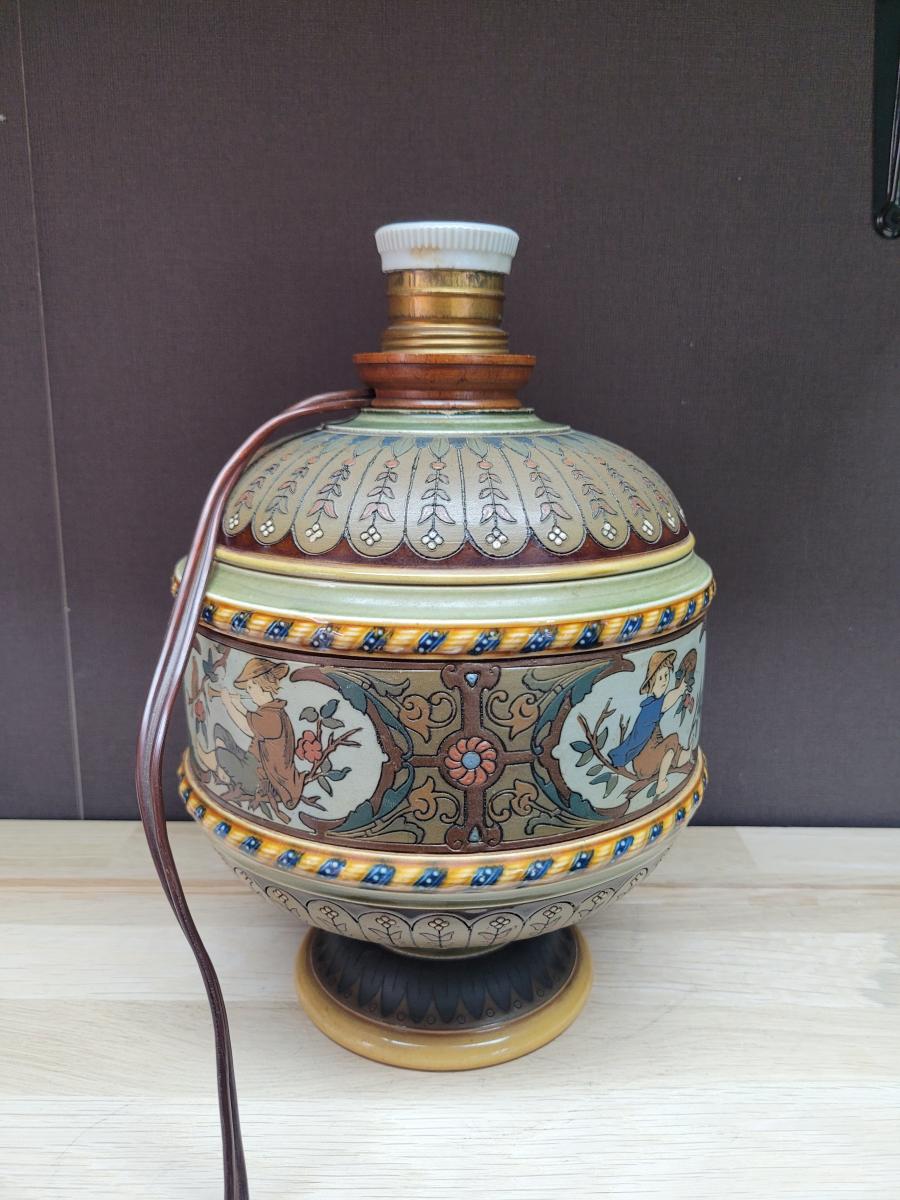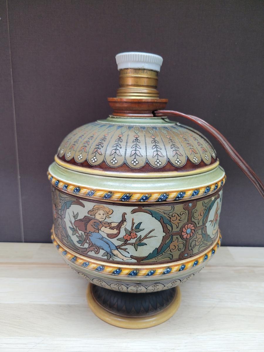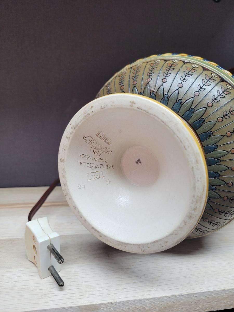 Take a Mettlach vase, mold 1591, cut off the top, and make a lamp base out of it. That's exactly what happened here..