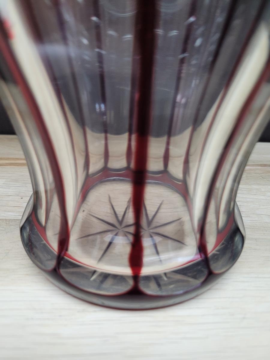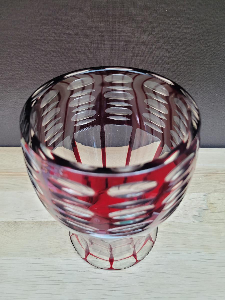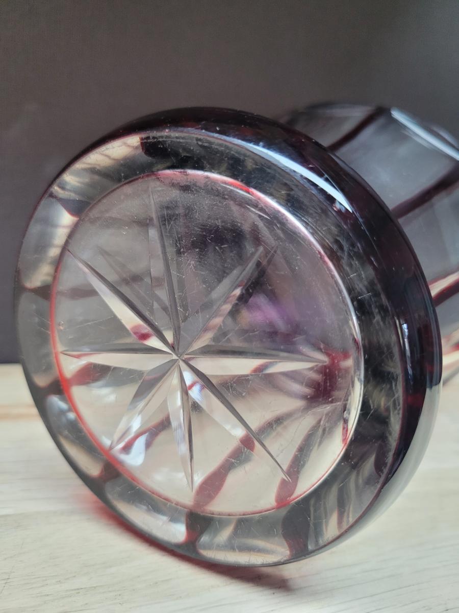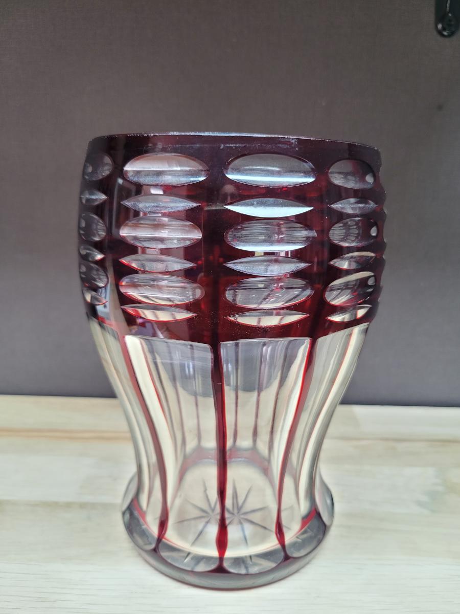 A cut glass or vase, transparent and ruby red color. Made anytime between 1880 and 1950, I assume. It may originate from one of the many "Glashütten" in Bohemia, but that too is unconfirmed.