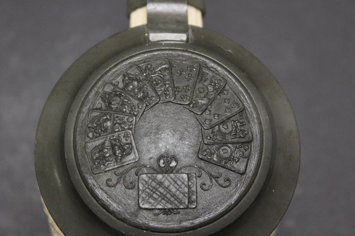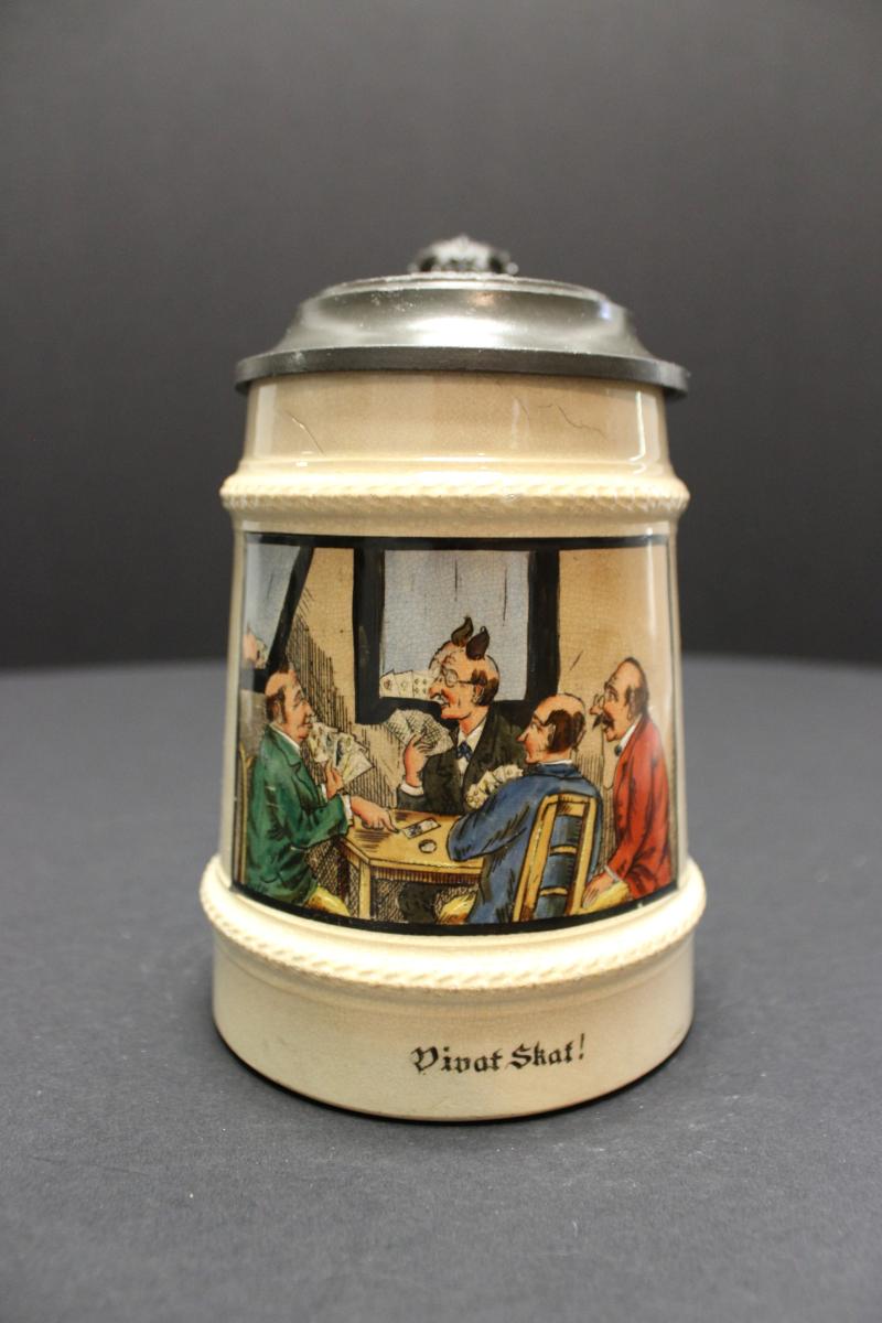 Print under glaze decoration depicting a group of gentlemen playing a card game. The text translation is "Long Live Skat!"