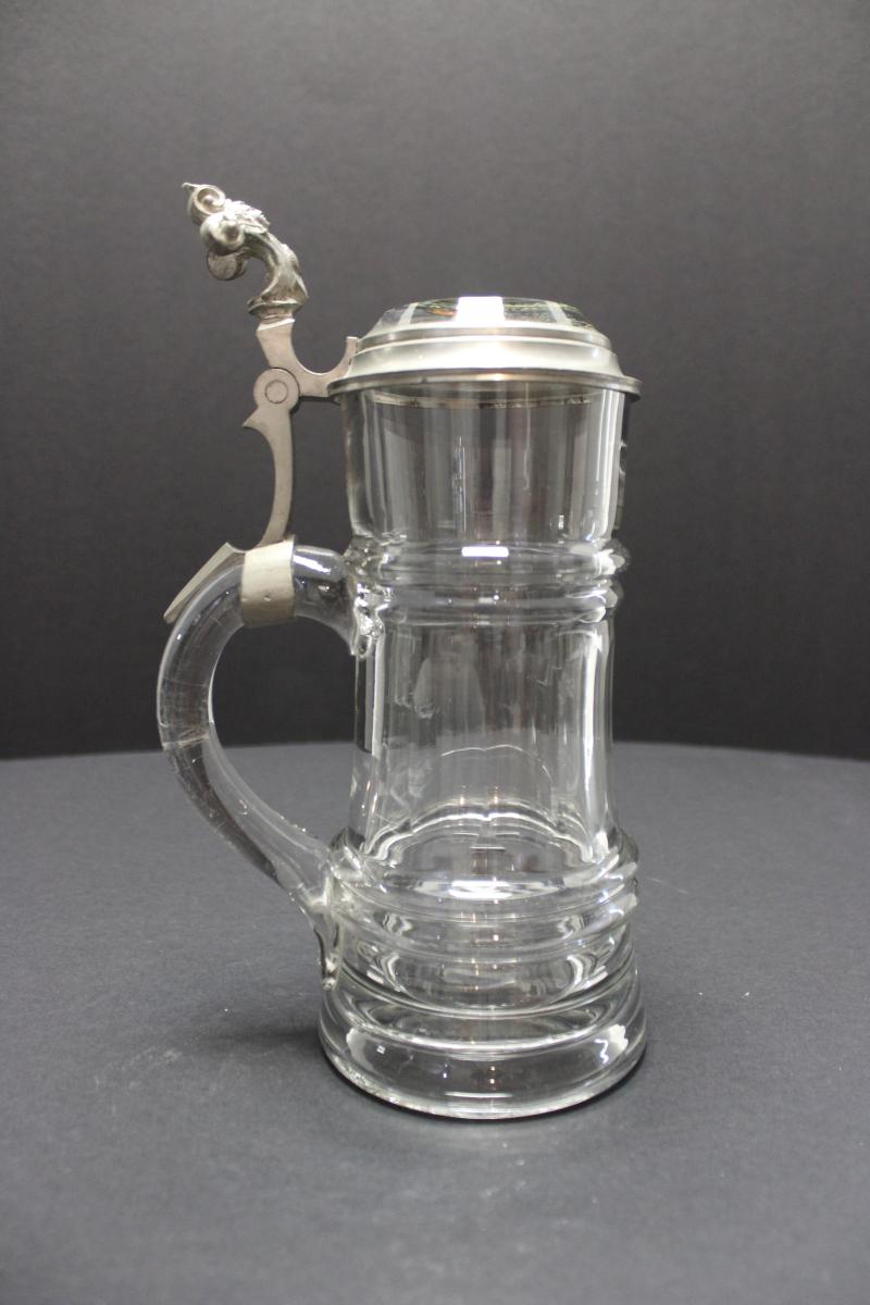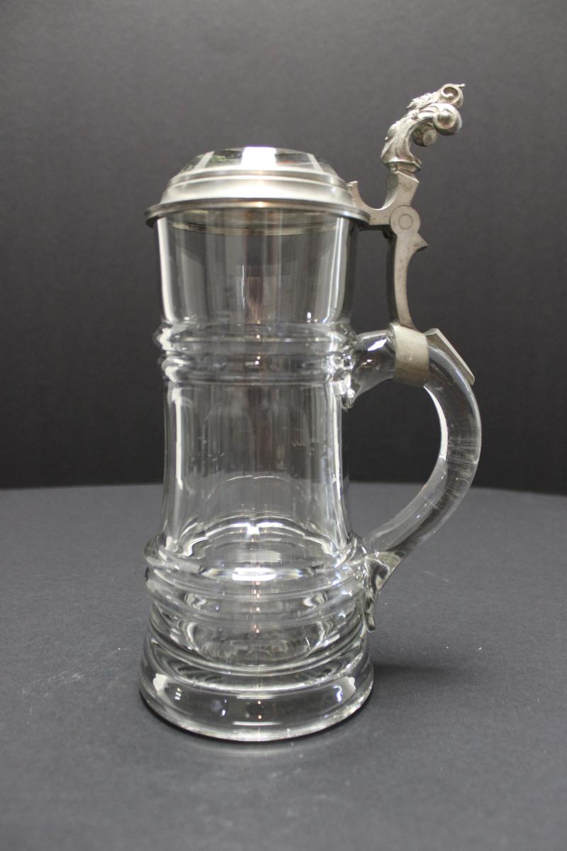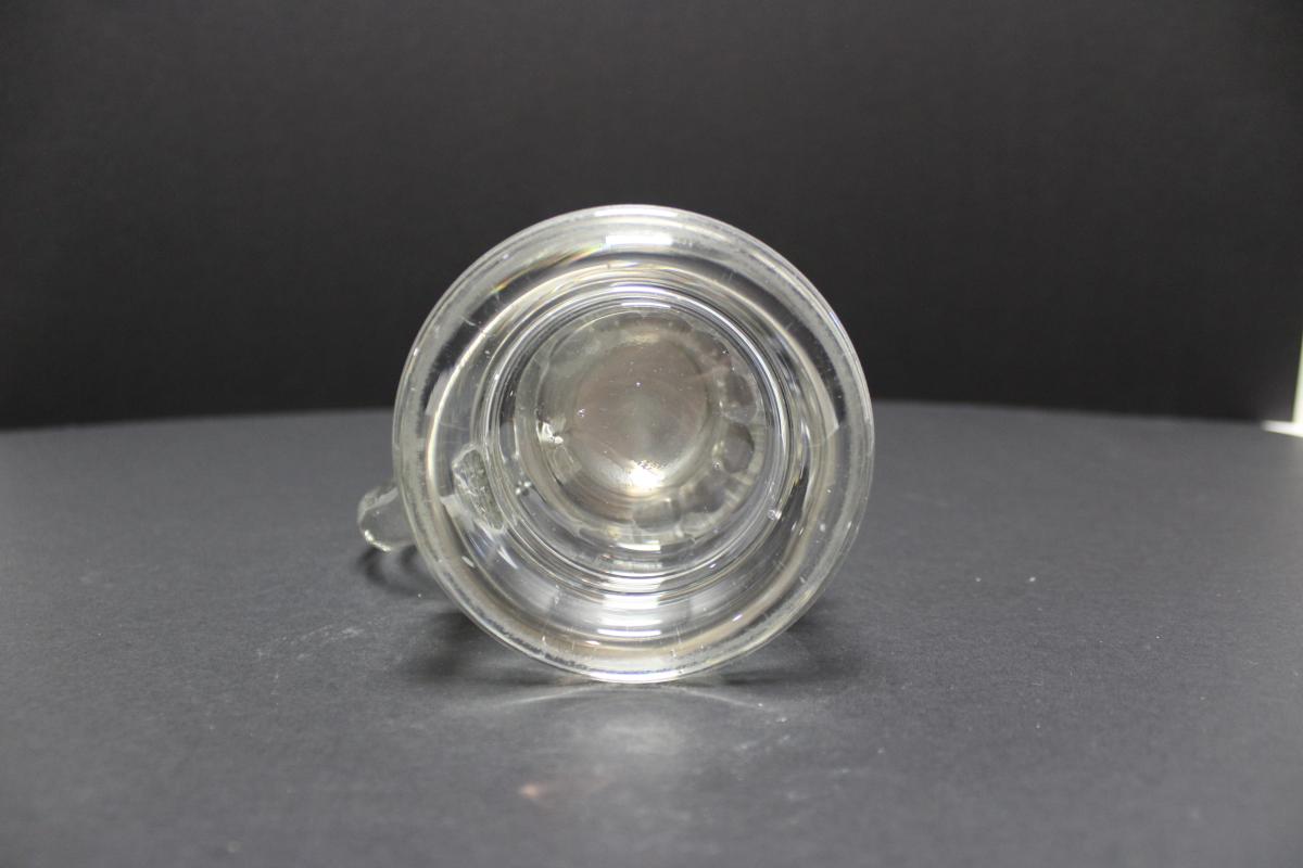 Mold blown glass with mold formed rings and stone wheel ground/polished facets around the center of the body. Thick bell-shaped base. Thick, round applied handle approximately 1/2 the length of the body.
