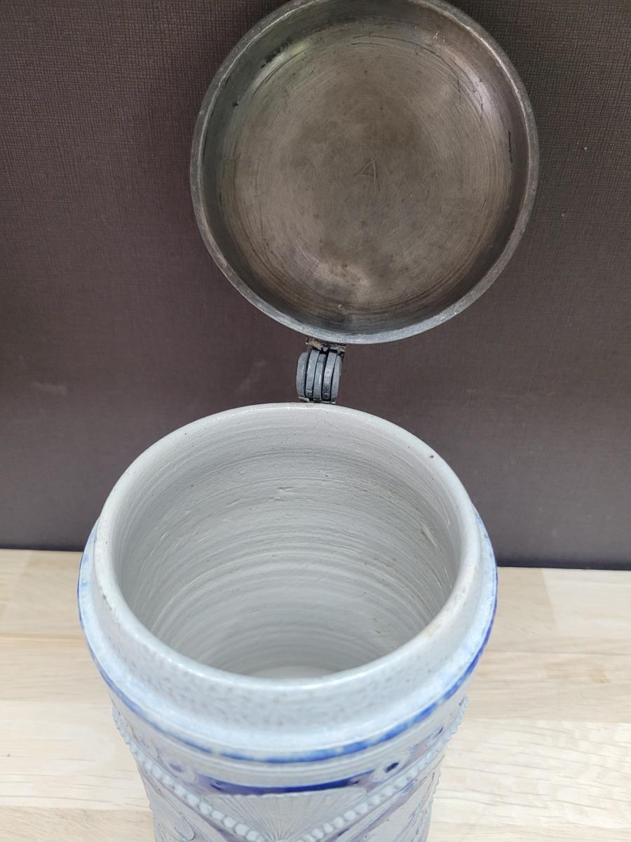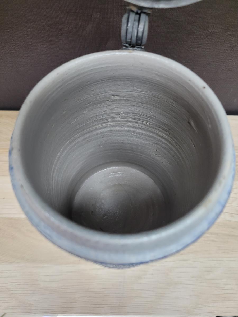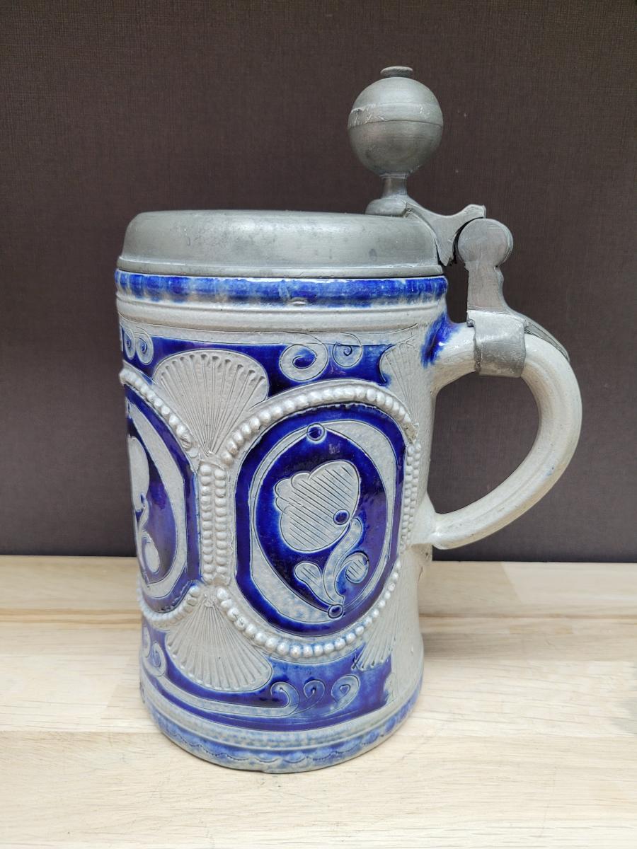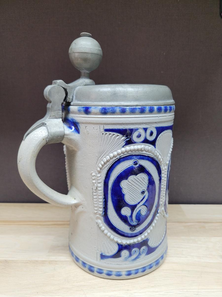 A lidded beer stein, made in the westerwald area, possibly made in the late 1700's to early 1800's.