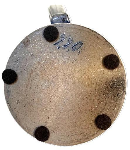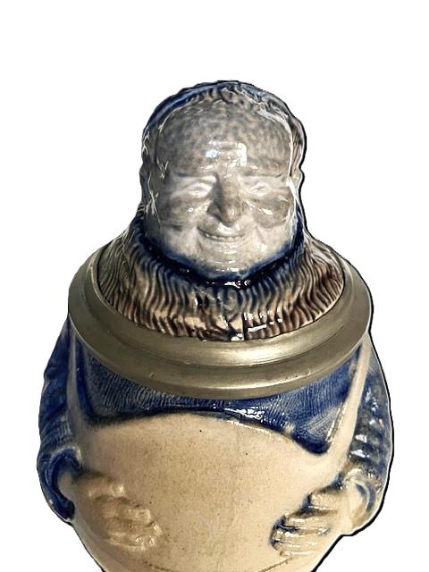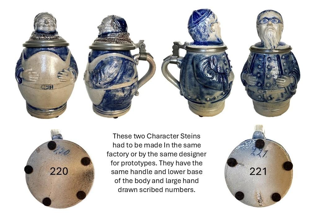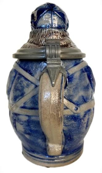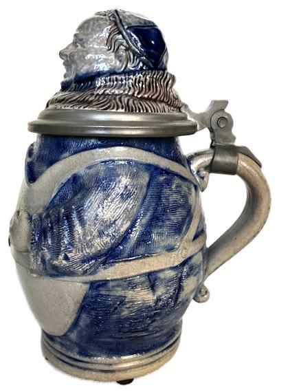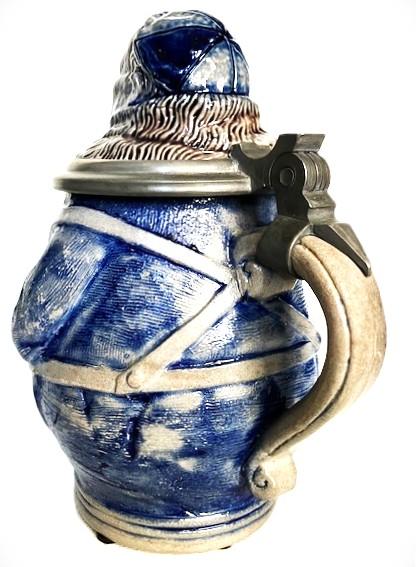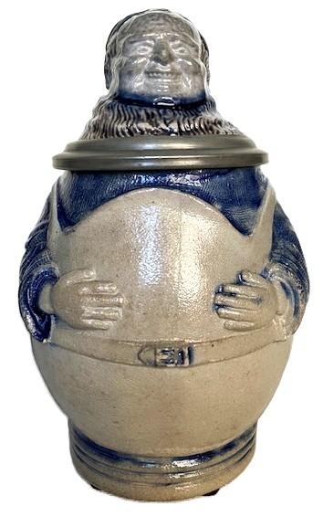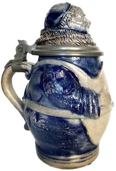 Butcher, Bartender, Baker or Blacksmith? There are not many character steins with a large apron like this. I bought it like this, but it looks like the original head was broken and replaced with this Hanke Monk #67 head, As, you can see it's wider than the body. I have never seen this body before that's why I bought it. The only marks are the large hand scribed 220. I would love some feedback about who you think made the body, thank you all in advance. My guess would be Schon & Borho in 1876 the first owners of the Freising factory pre-Hauber & Reuther. It may have been made as a prototype.