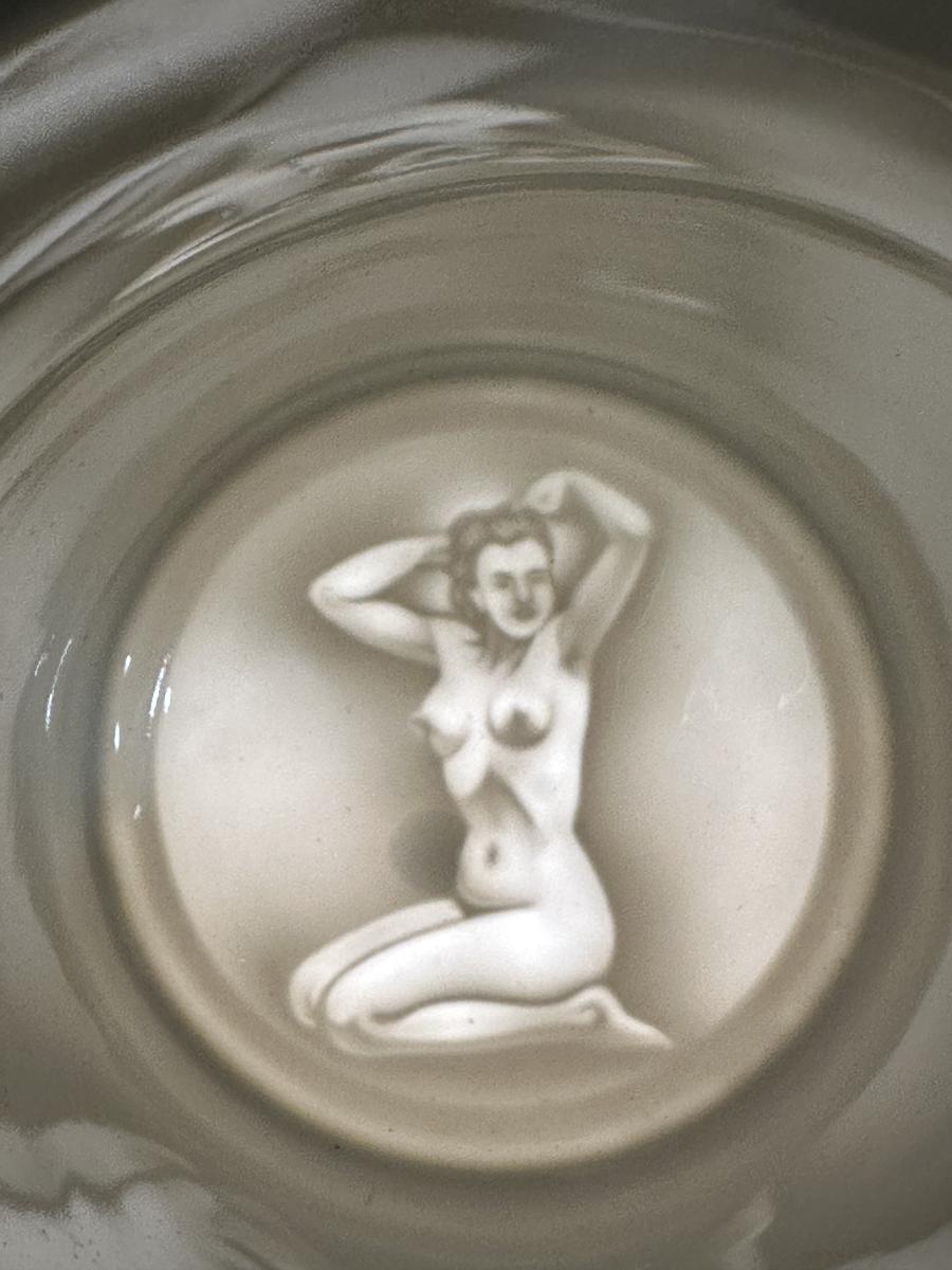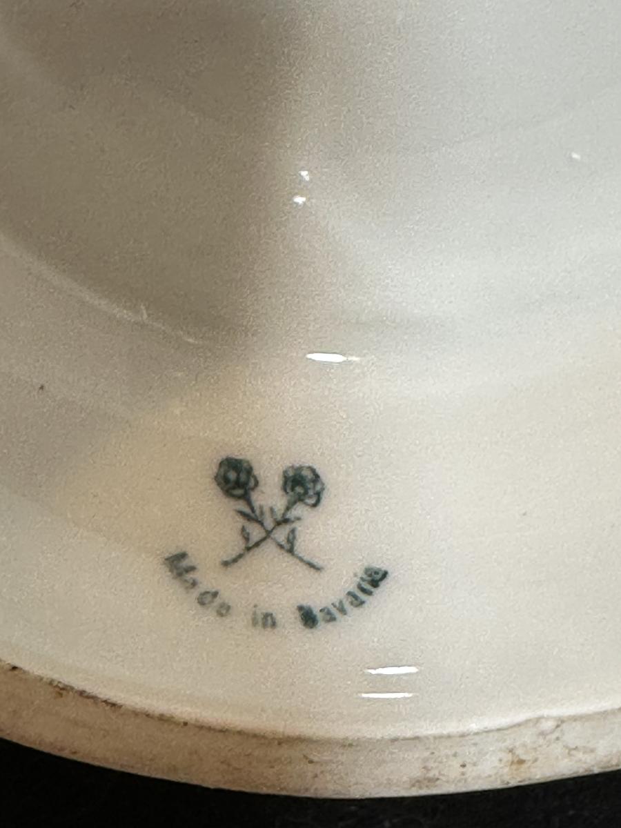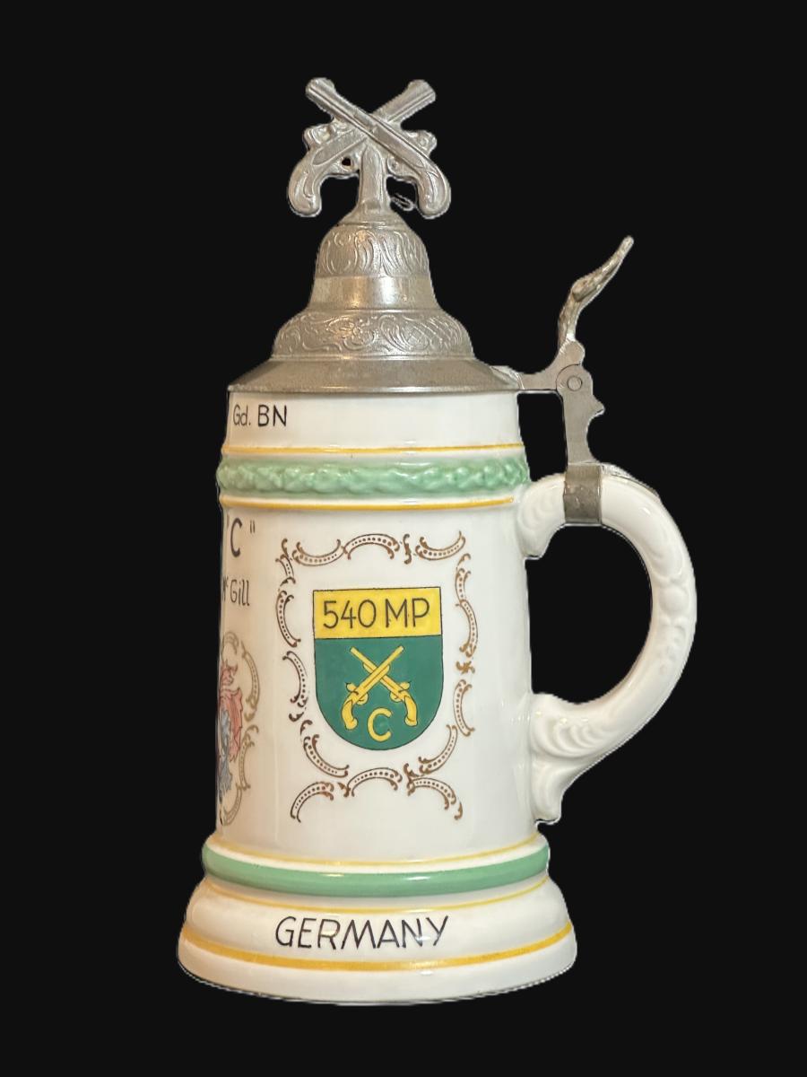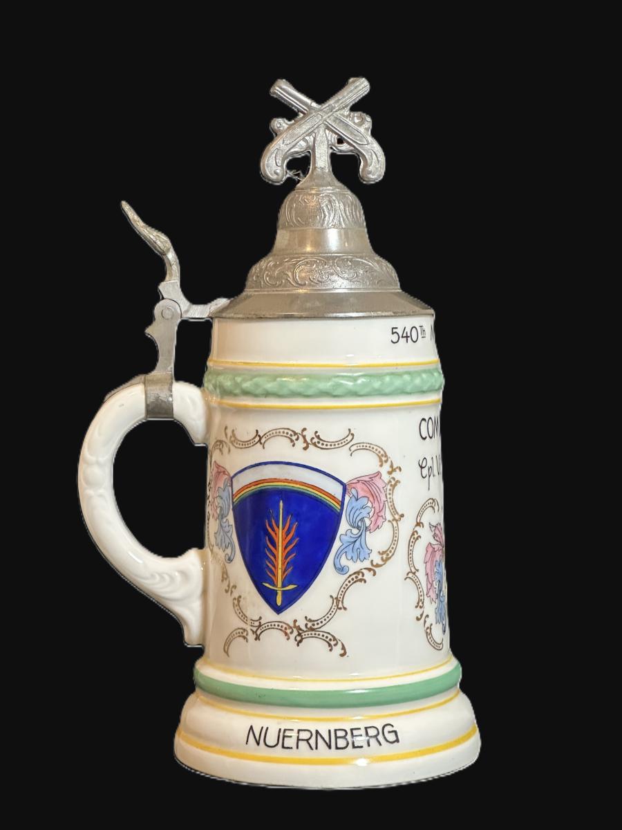 1/2 liter, porcelain, Cold War Stein named to Corporal Vincent E. McGill, C Co., 540th MP Railway Guard Bn., with a cross pistol finial. The Central Scene is of the Nuremberg Coat of Arms 1954. The right side scene is the USAREUR shoulder patch and the left side is the unit crest. The manufacturer's mark of crossed roses with Made in Bavaria beneath belongs to the firm Roesler, Tettau, Germany.