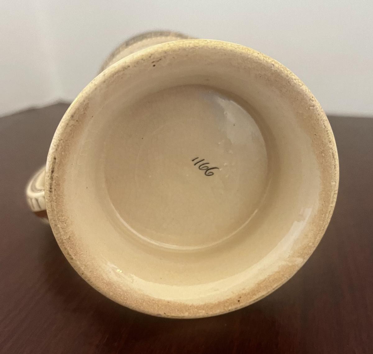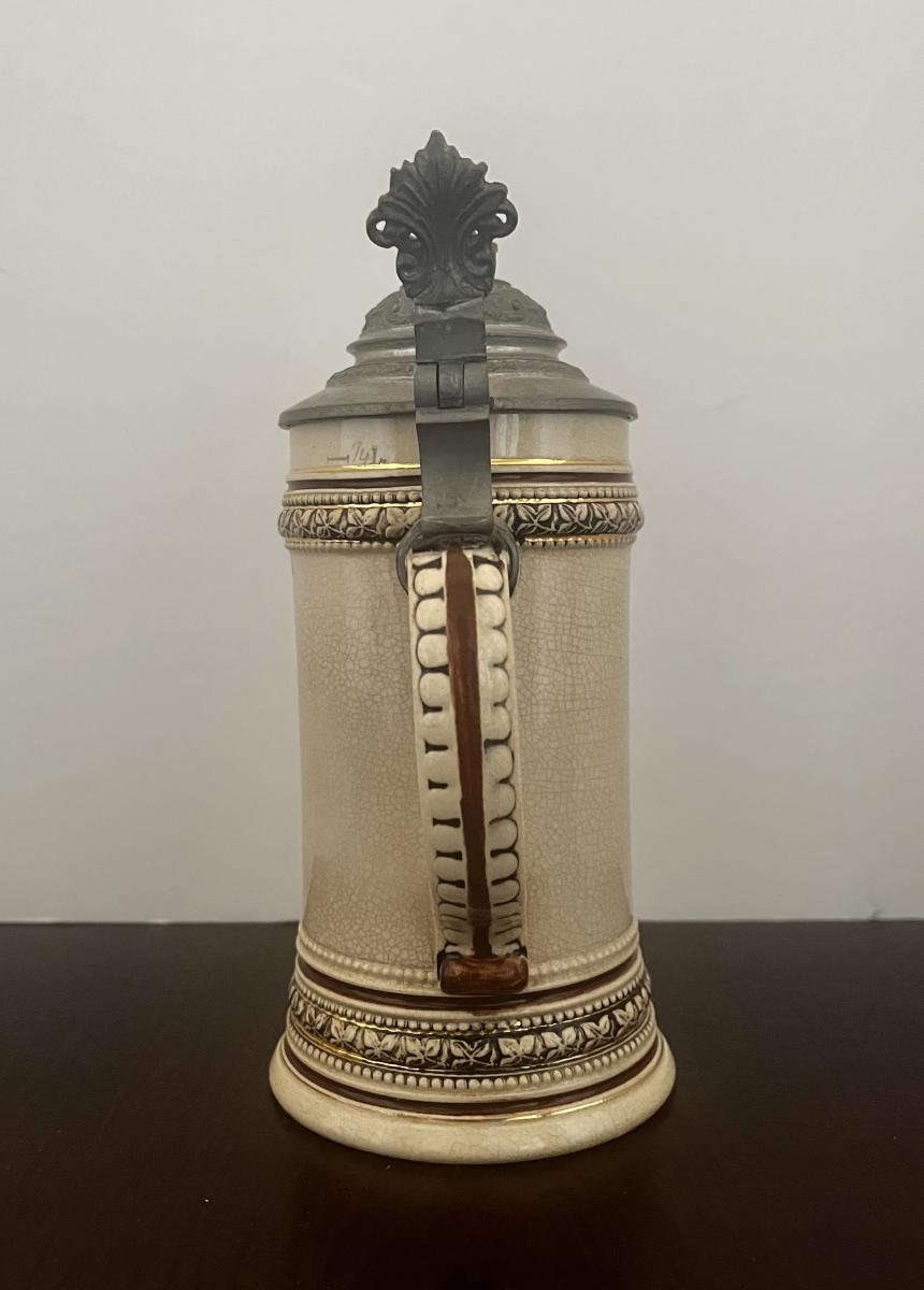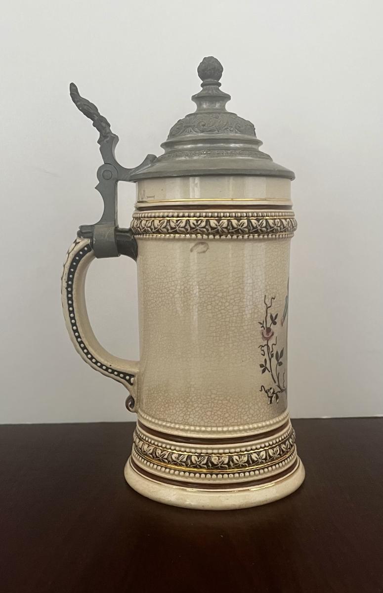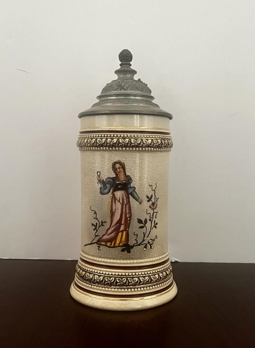 1/4 liter print over glaze stein is not specifically listed in the Beer Stein Library. However, an exact copy that is 1/2 liter is. This stein is 1166, the listed stein in BSL is 1186. The stein shows a pretty Girl in a pink dress drinking a glass of wine…