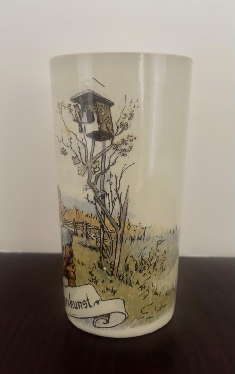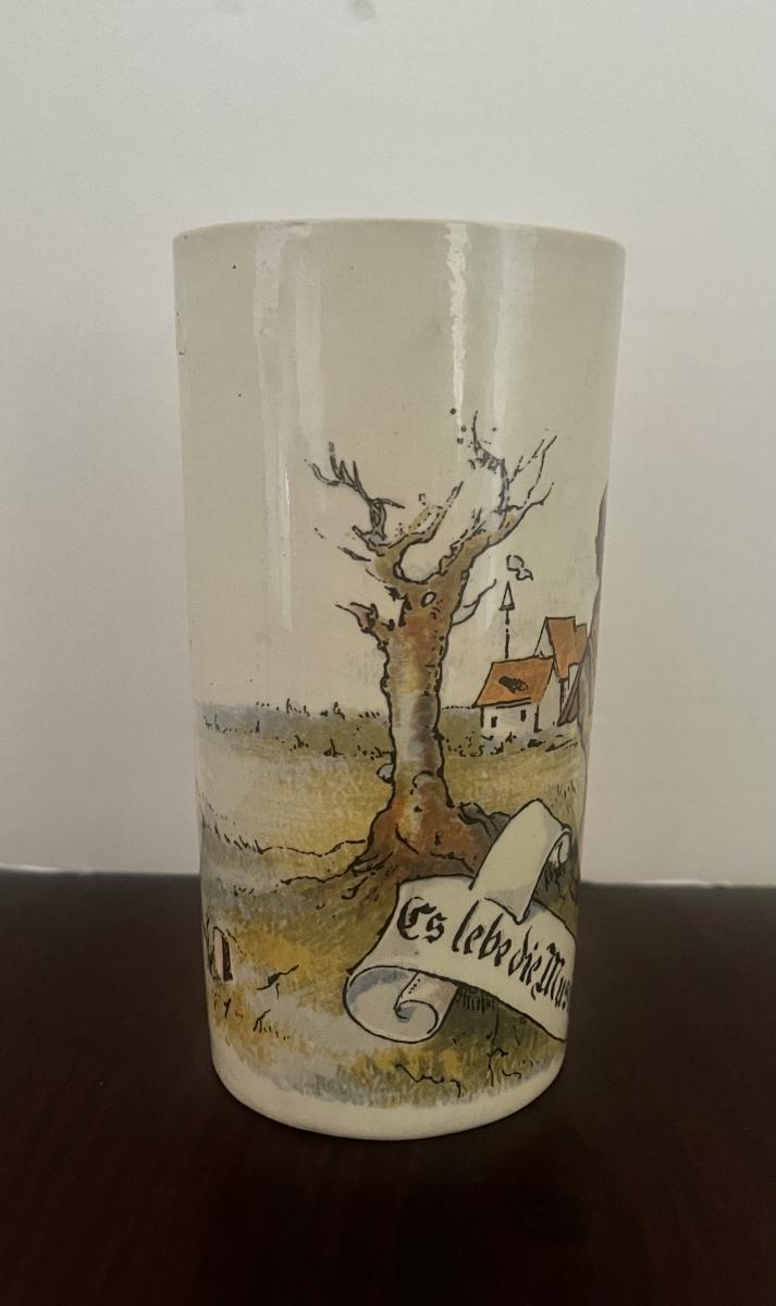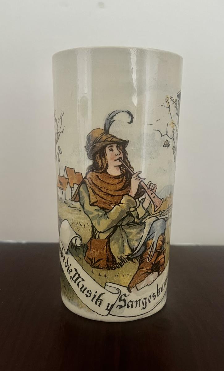 This Mettlach beaker portrays a piper playing in front of a bird house. The beaker matches v and B stein 2349/1024