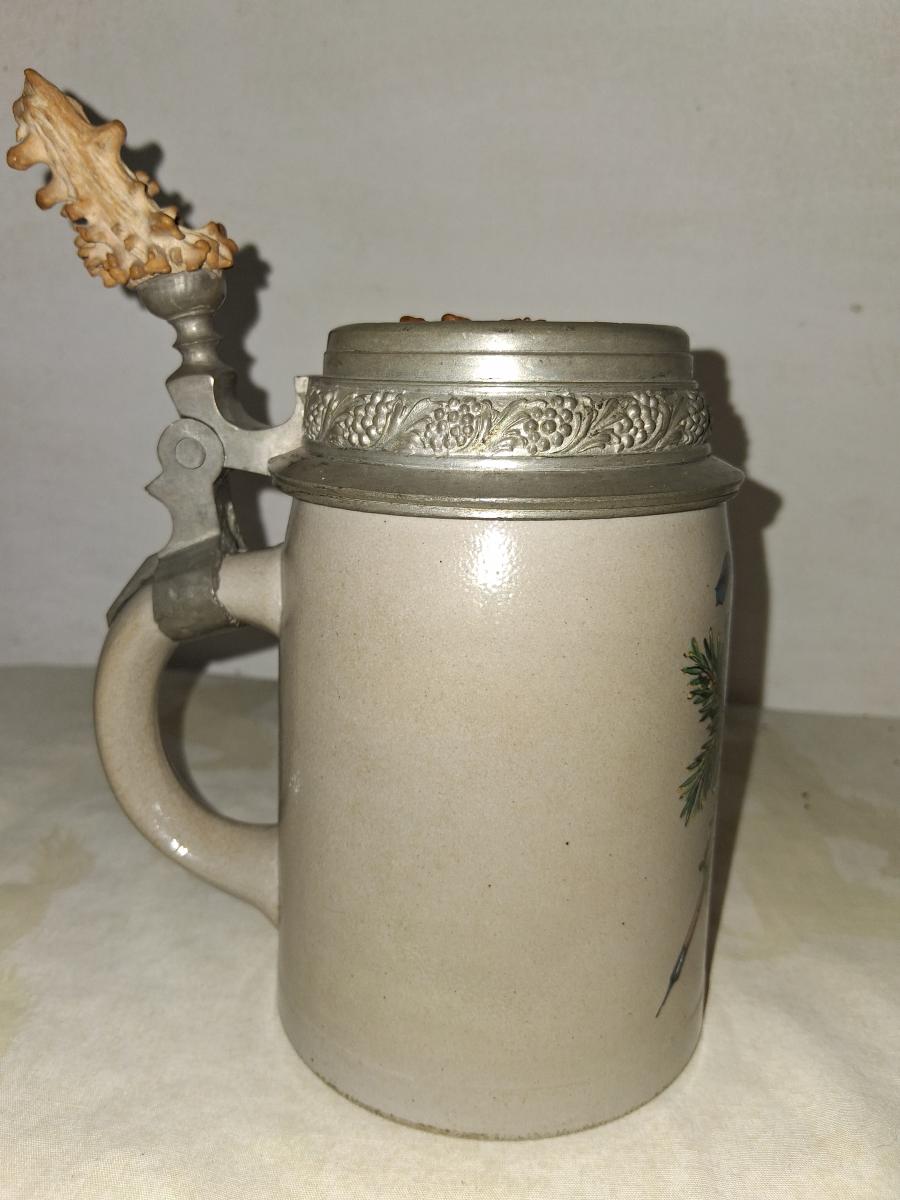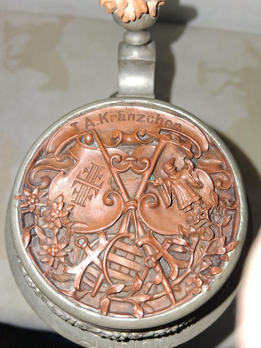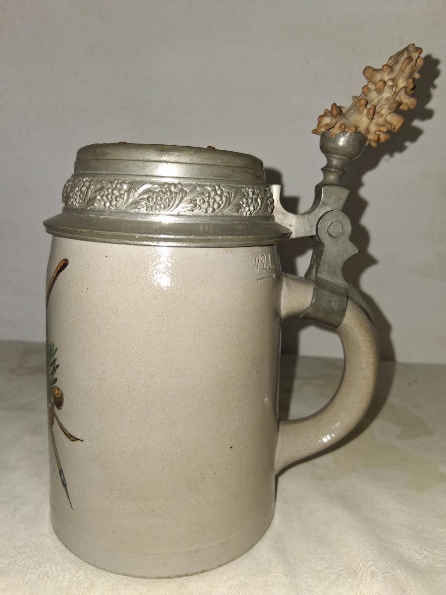 One of Merkelbach and Wick's various sujects stein bodies. Salt glaze. Transfer with hand painted hifhlights. Decoration features hiking implements. Copper relief insert inscribed with 4F symbol and " T. A. Cranshen". Antler thumblift.