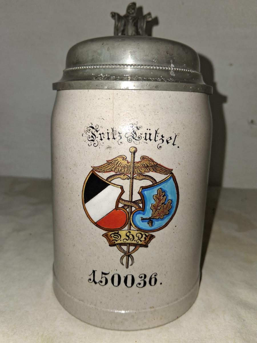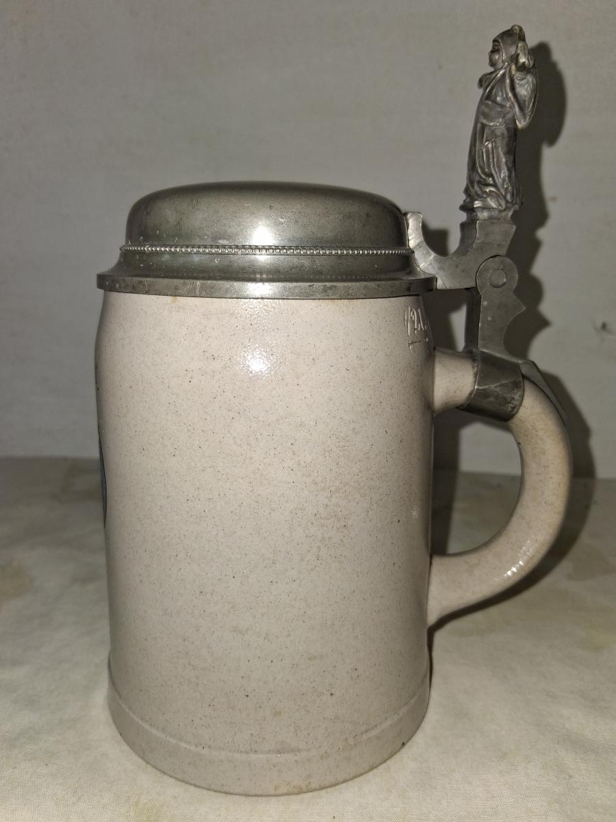 Salt glazed. Decoration transfer and enameled. Named to Fritz Lützel. Lid engraved with Munich Child thumblift.