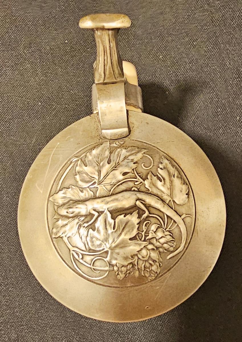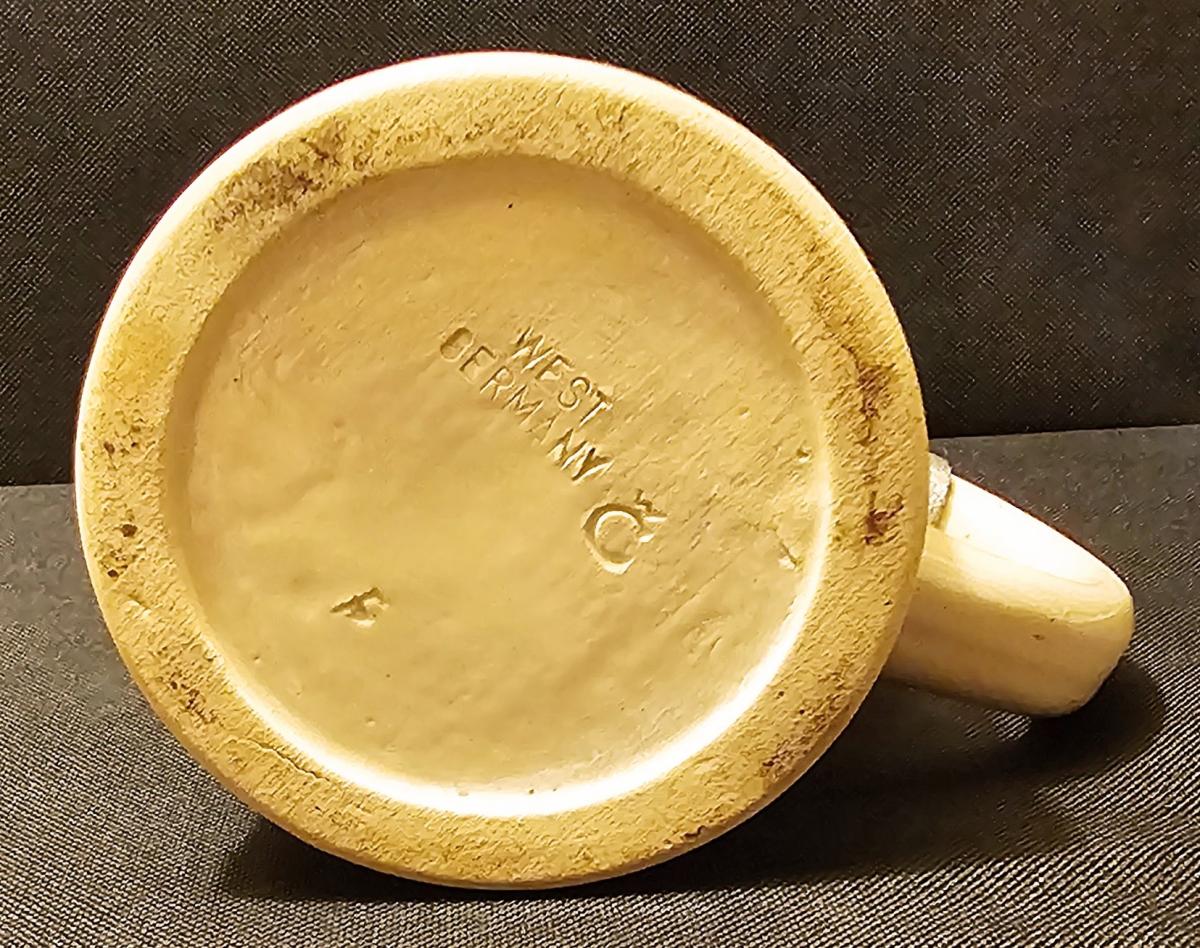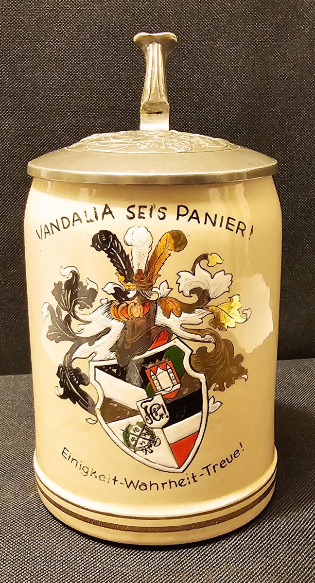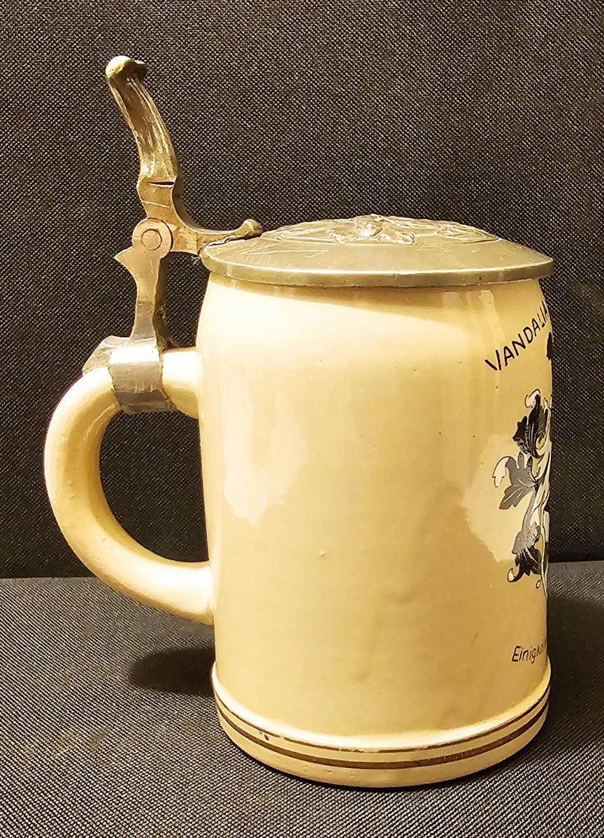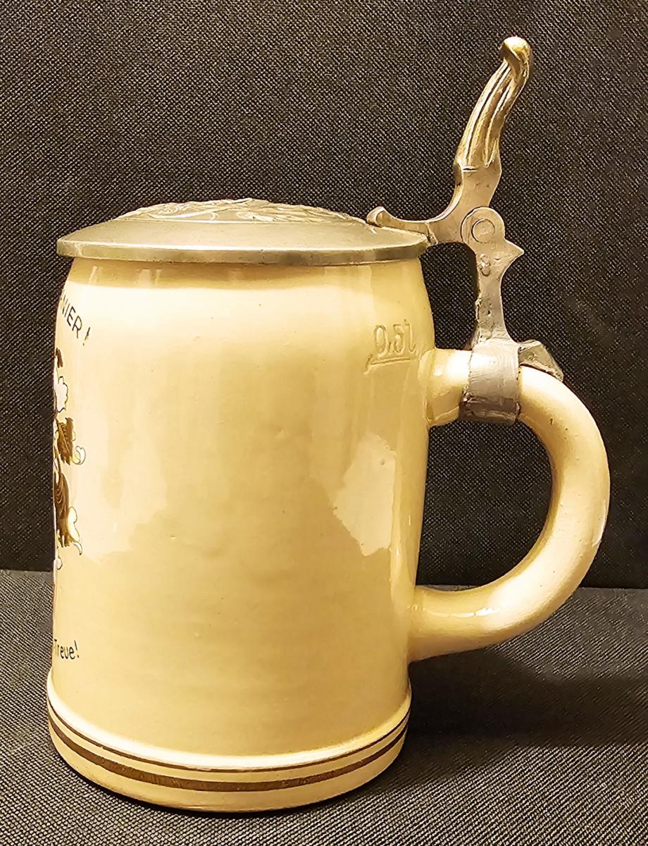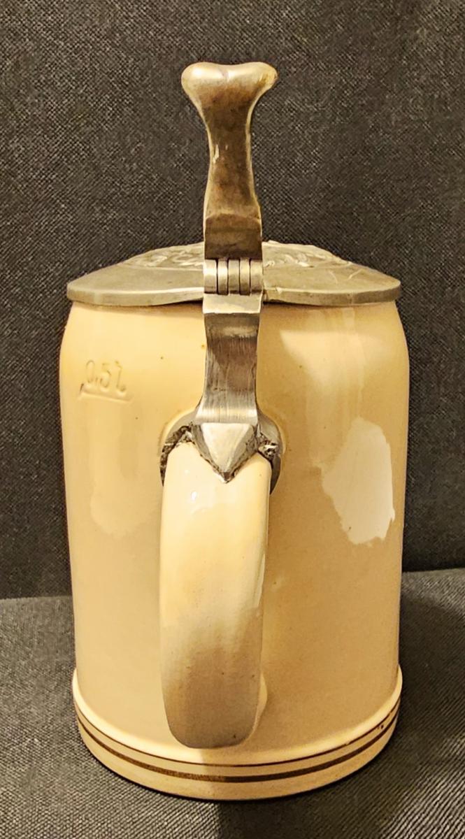1/2 liter pottery student stein with hand embellished print over glaze with pewter lid with 3D lizard design. Circa mid 1900s
