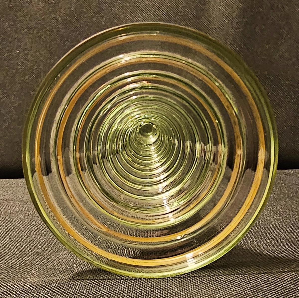 Green/amber Moeser style roemer decorated with floral design. Has prunts mid-stem and gold gilding. Circa 1880-1915