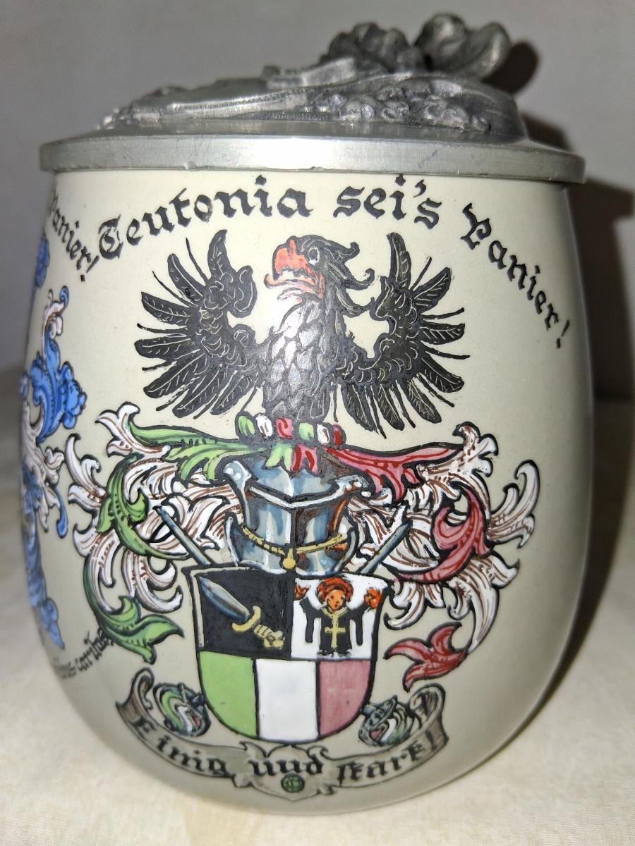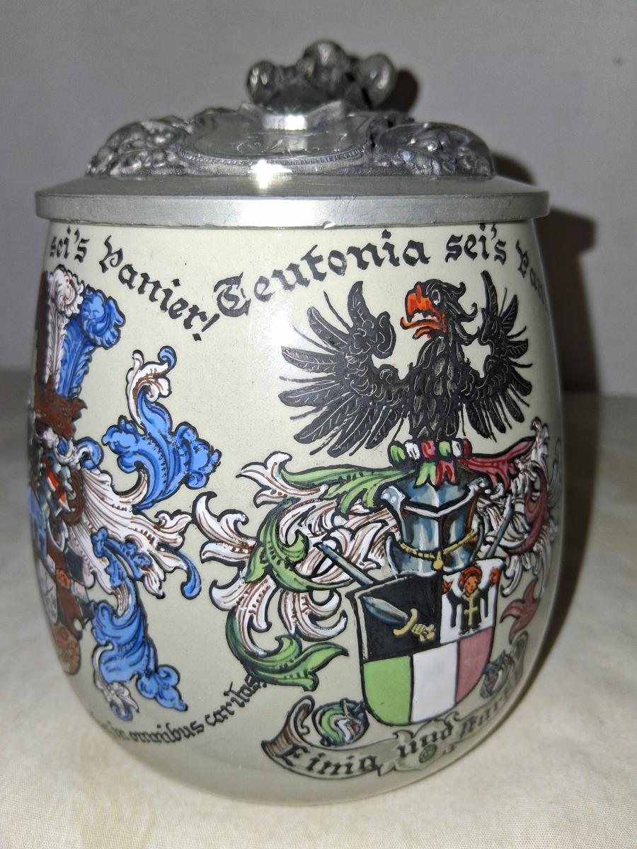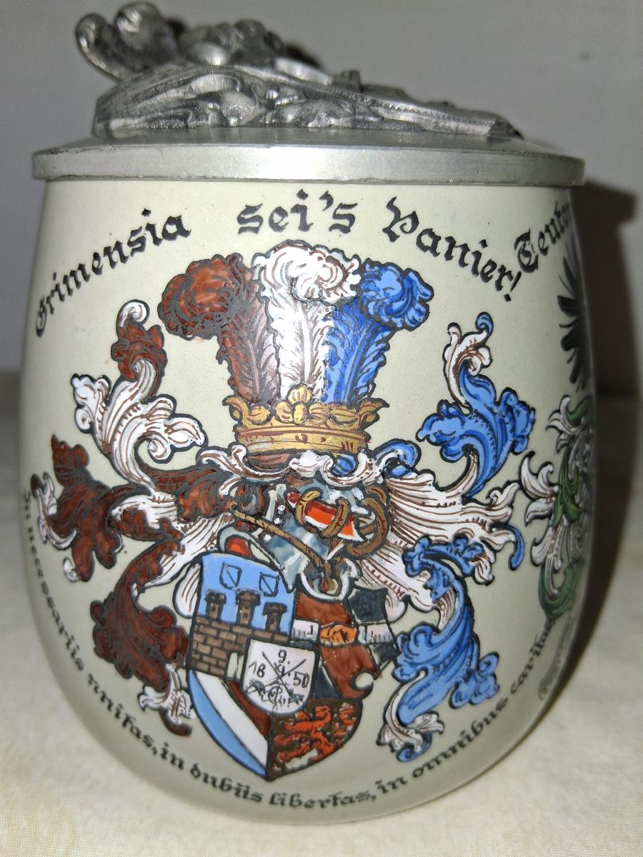 This stein body was often used for student steins, see here [link] among other things. I cannot find anything on Grimensia, it was a dueling society. Also I can't get much on Teutonia, it is a generic term referring to various cultural aspects of Germany going back to the Teutons. There was and is a Teutonic student society that is political in nature, perhaps this refers to that. The coat of arms does include the Munich Child indicating a Munich location. I'll update this with more information hopefully. A zirgil is engraved on the lid.