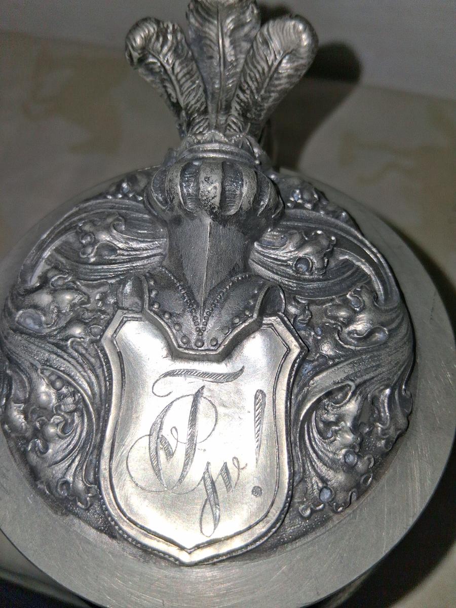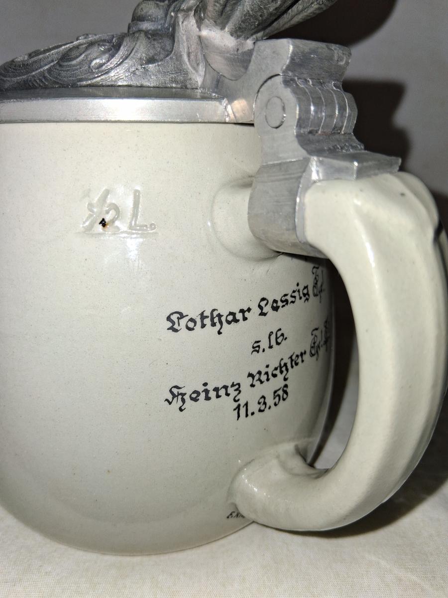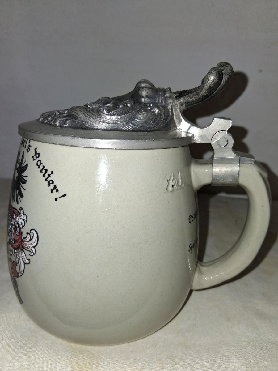 This stein body was often used for student steins, see here [link] among other things. I cannot find anything on Grimensia, it was a dueling society. Also I can't get much on Teutonia, it is a generic term referring to various cultural aspects of Germany going back to the Teutons. There was and is a Teutonic student society that is political in nature, perhaps this refers to that. The coat of arms does include the Munich Child indicating a Munich location. I'll update this with more information hopefully. A zirgil is engraved on the lid.