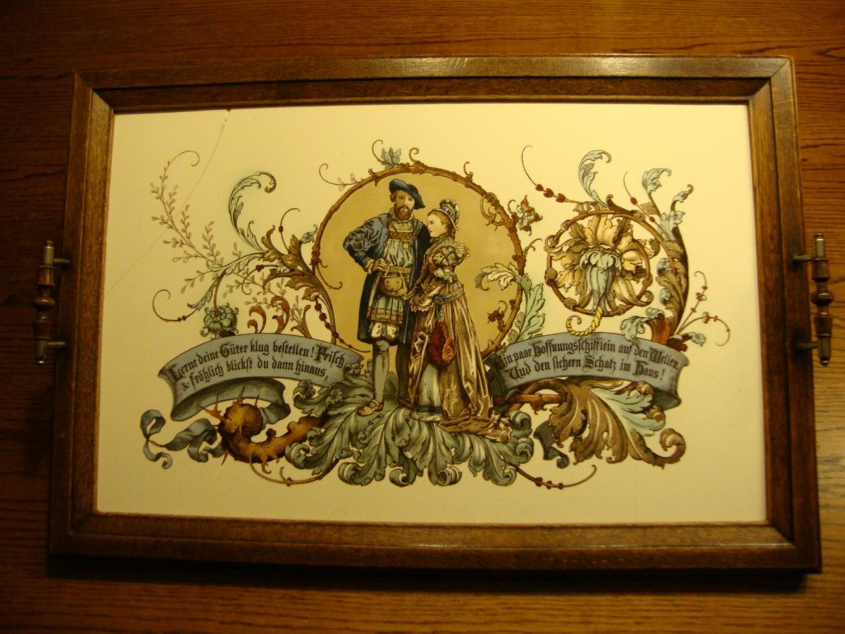 I attribute this tray to Villeroy and Boch (Mettlach) based on the decorating technique compared with other similar items.