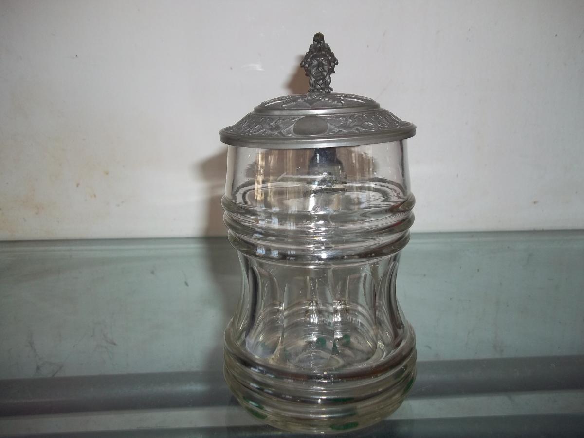 A hand blown, wasp waisted stein with a pewter lid, jester thumblift.